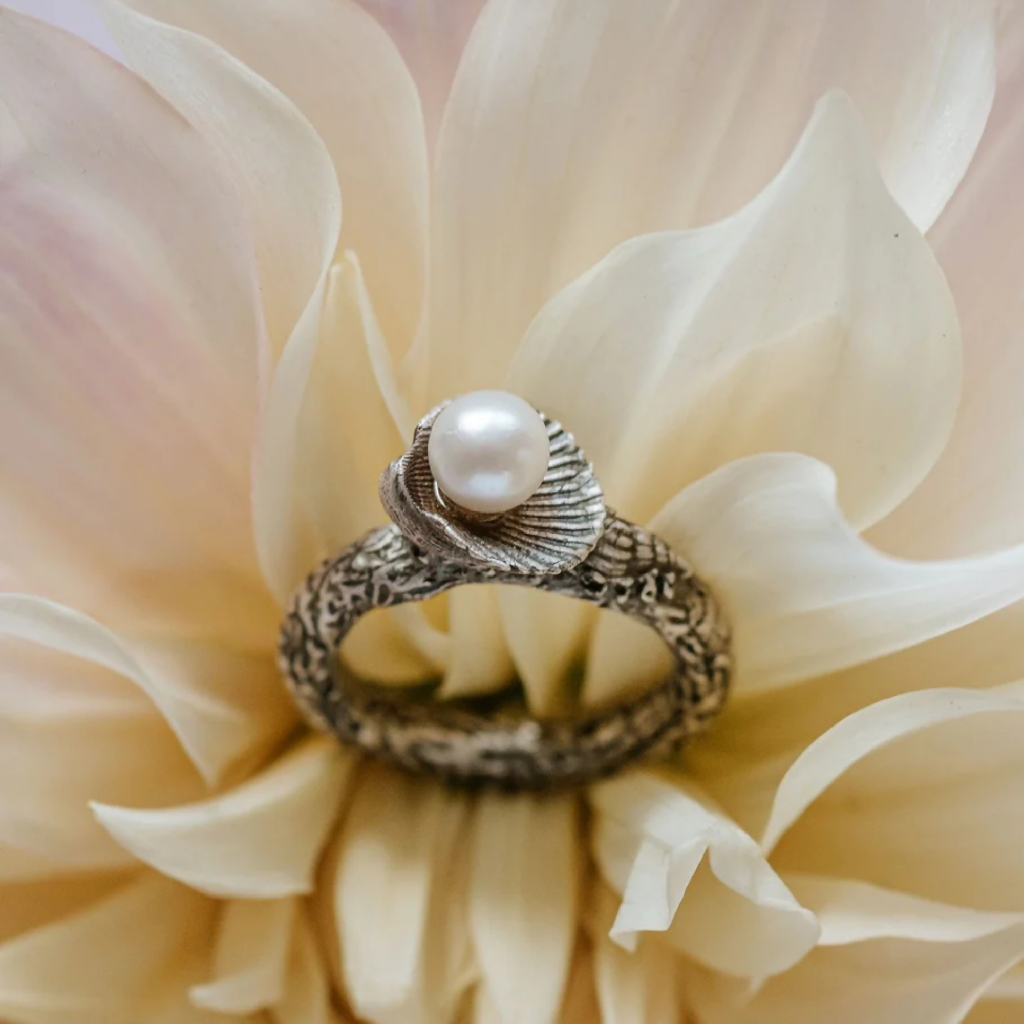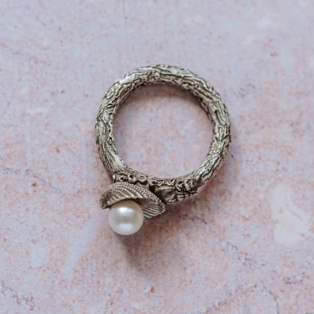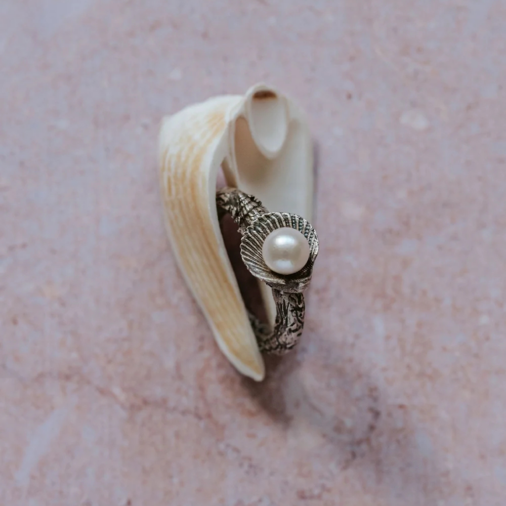 A little treasure washed in from the tide, this statement ring captures the quiet beauty of the shoreline in fine silver. At its centre rests a luminous freshwater pearl, nestled inside a sculpted silver shell that curves around it like a protective embrace. Every ridge, swirl, and contour echoes the textures of the coast — from driftwood patterns to salt-softened coral.