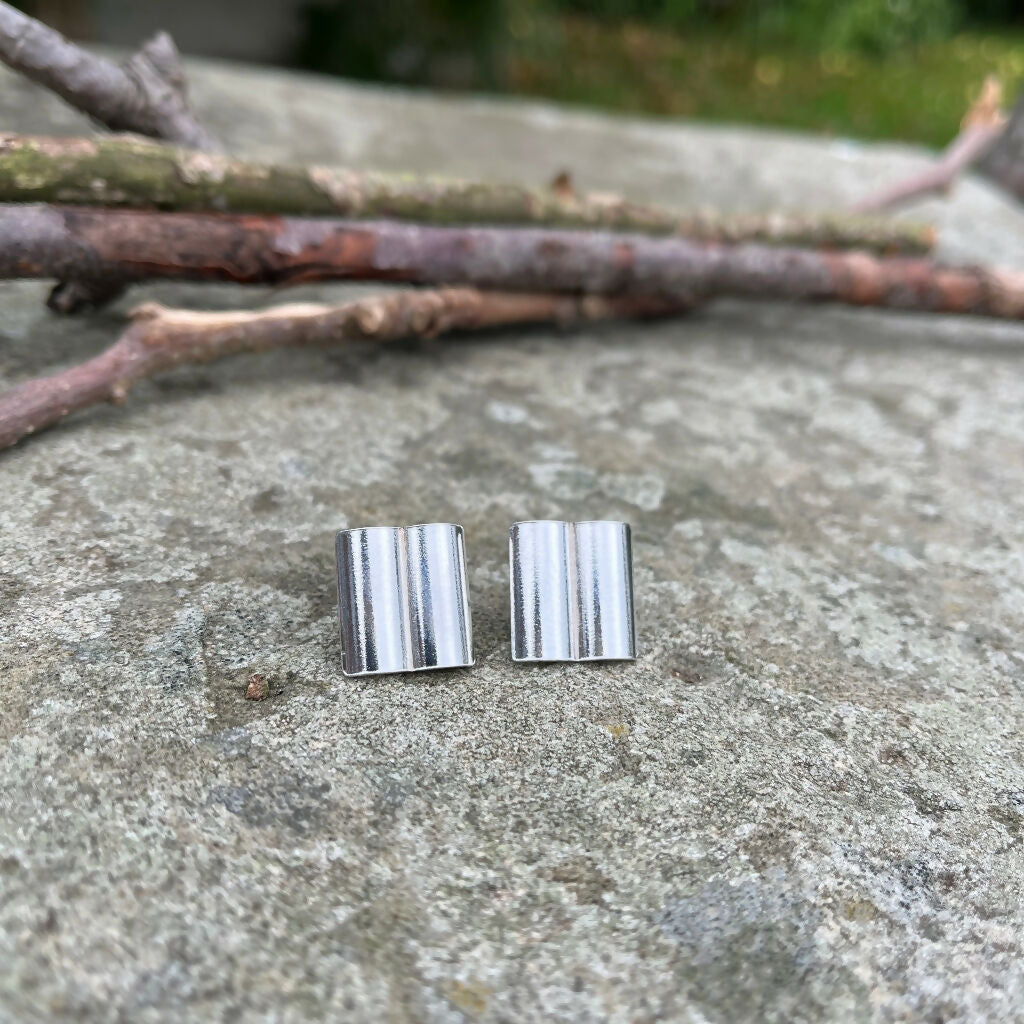 These smart handmade square sterling silver stud earrings will dress up any outfit instantly. These contemporary ear-studs have a shiny polished finish and a post and butterfly scroll fitting.