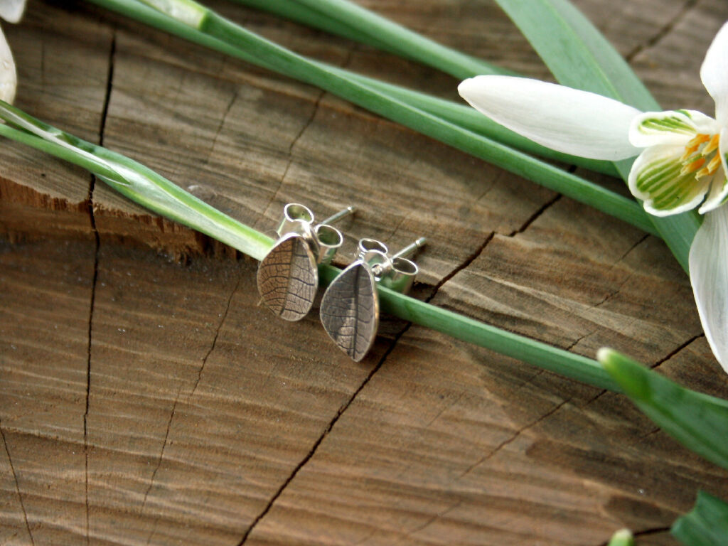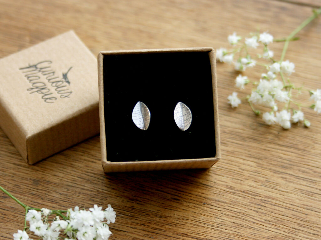 Handcrafted from sterling silver, these charming leaf stud earrings are each created from a real leaf, carefully soldered to silver posts and finished with butterfly backs. Because every pair is made from a different leaf, each design varies slightly, making your earrings completely unique.