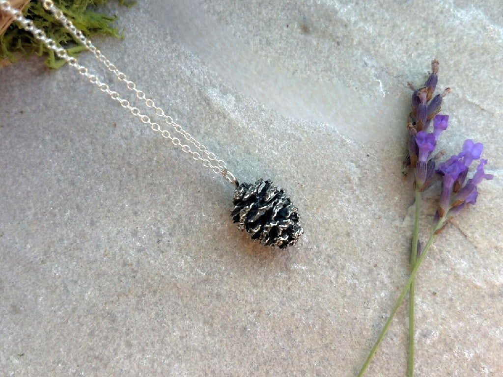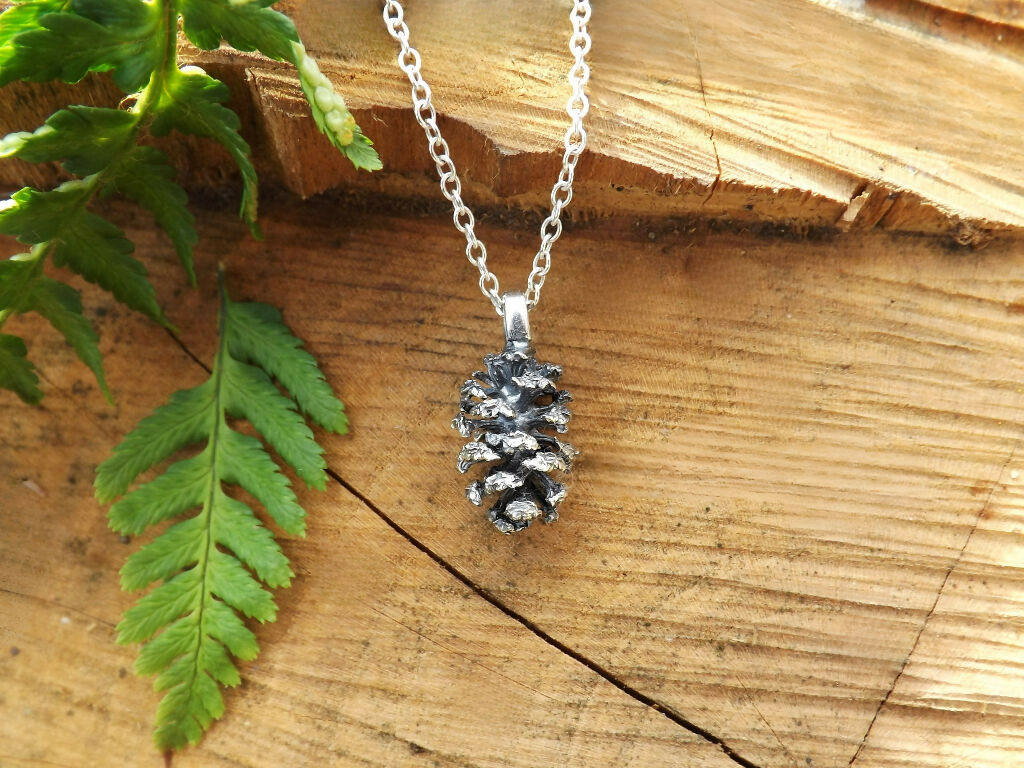 The silver pinecone is gently oxidised and polished to highlight the intricate textures and natural details of the original pinecone. Hung from a delicate sterling silver chain with a matching silver bail, this charming pendant is perfect for everyday wear or as a subtle finishing touch to a special outfit.