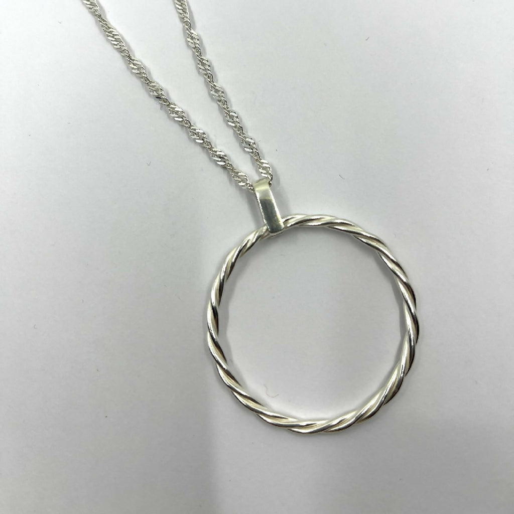 The necklace was hand-crafted in my West Yorkshire workshop in the UK - I used 925 silver round wire, and twisted 3 strands together. I then formed this twist into the hoop, and added the hand-crafted the bail.