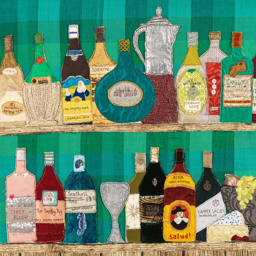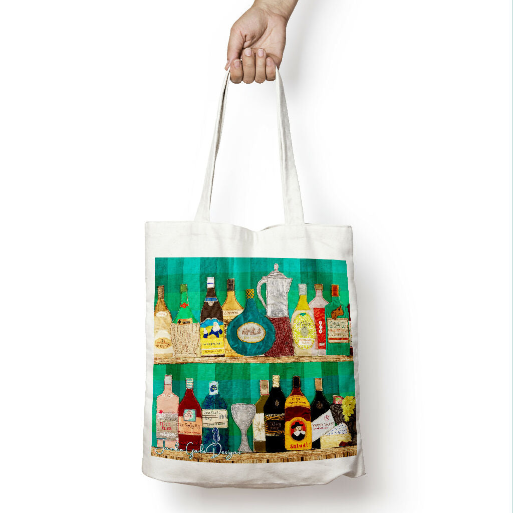 A lovely heavyweight canvas art tote bag featuring a fun-filled array of wine bottles created in textile art by Jackie Gale. A fabulous gift!