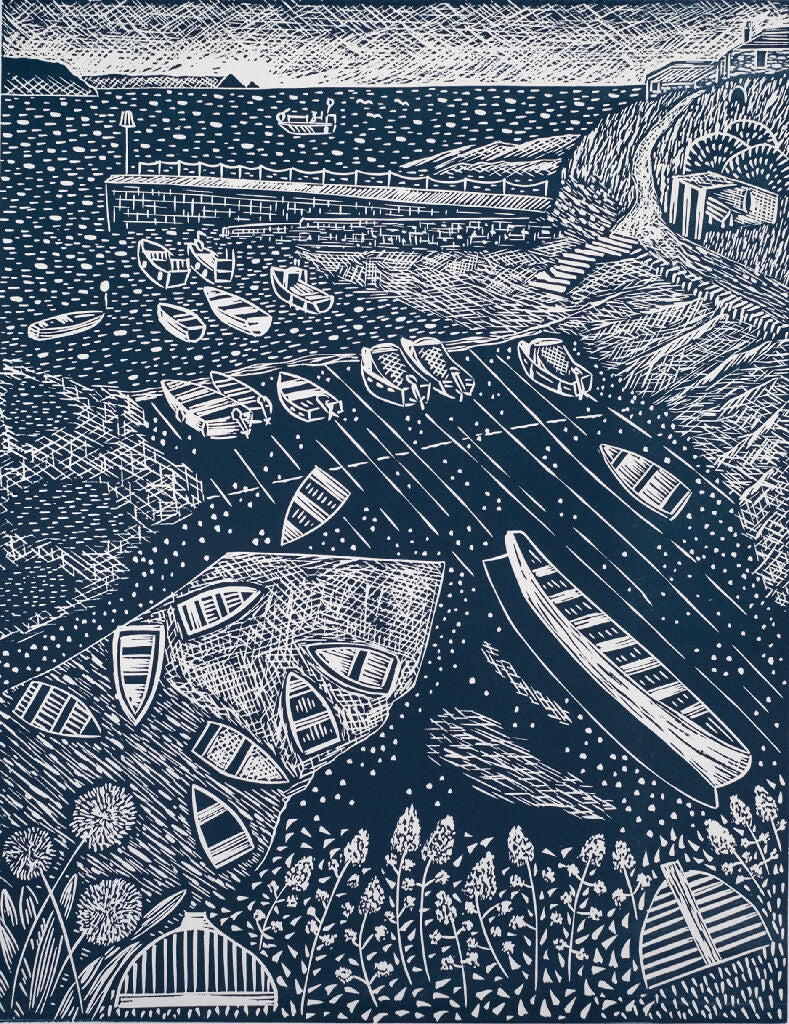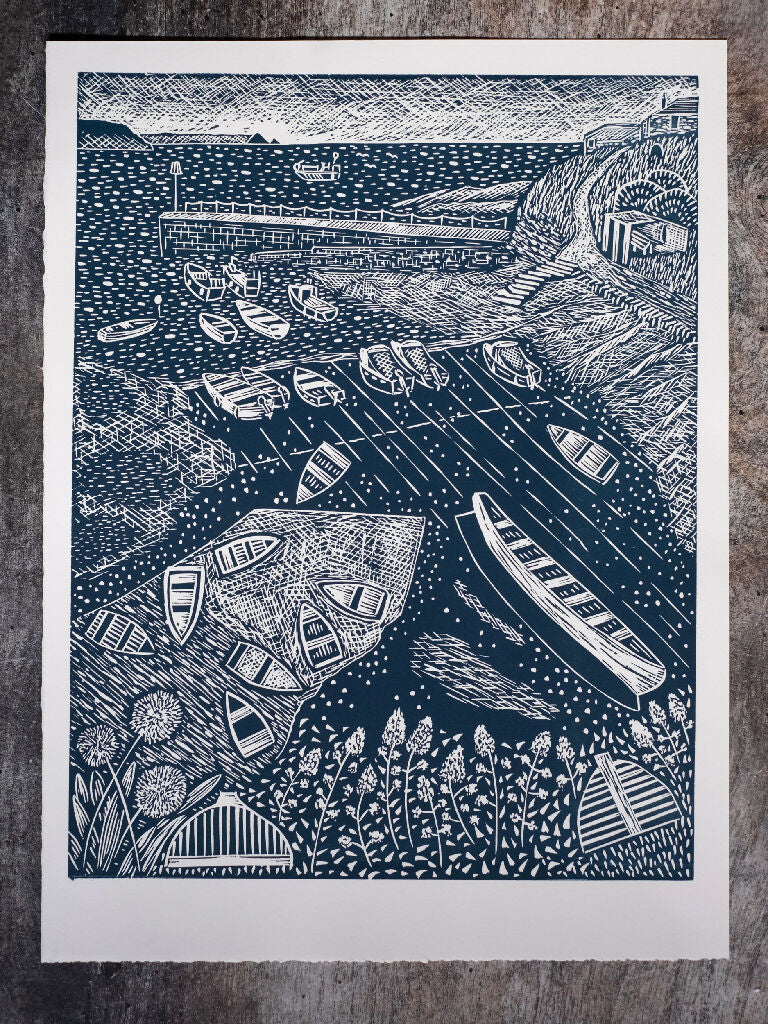 Limited edition lino print of coffee time in Portscatho harbour. Limited edition of 200. Printed onto the finest Somerset paper using Lino Lord's Lugger Blue which you can also ...