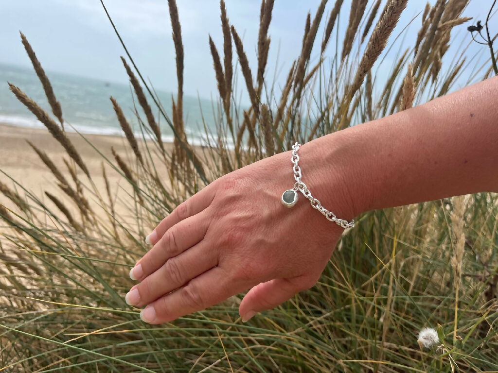 Sea glass bracelet Aqua green Seaglass, handset by hand in a silver bezel.Comes on a silver chain Inspired by the sea. Designed and handmade in Poole, Dorset, UK.