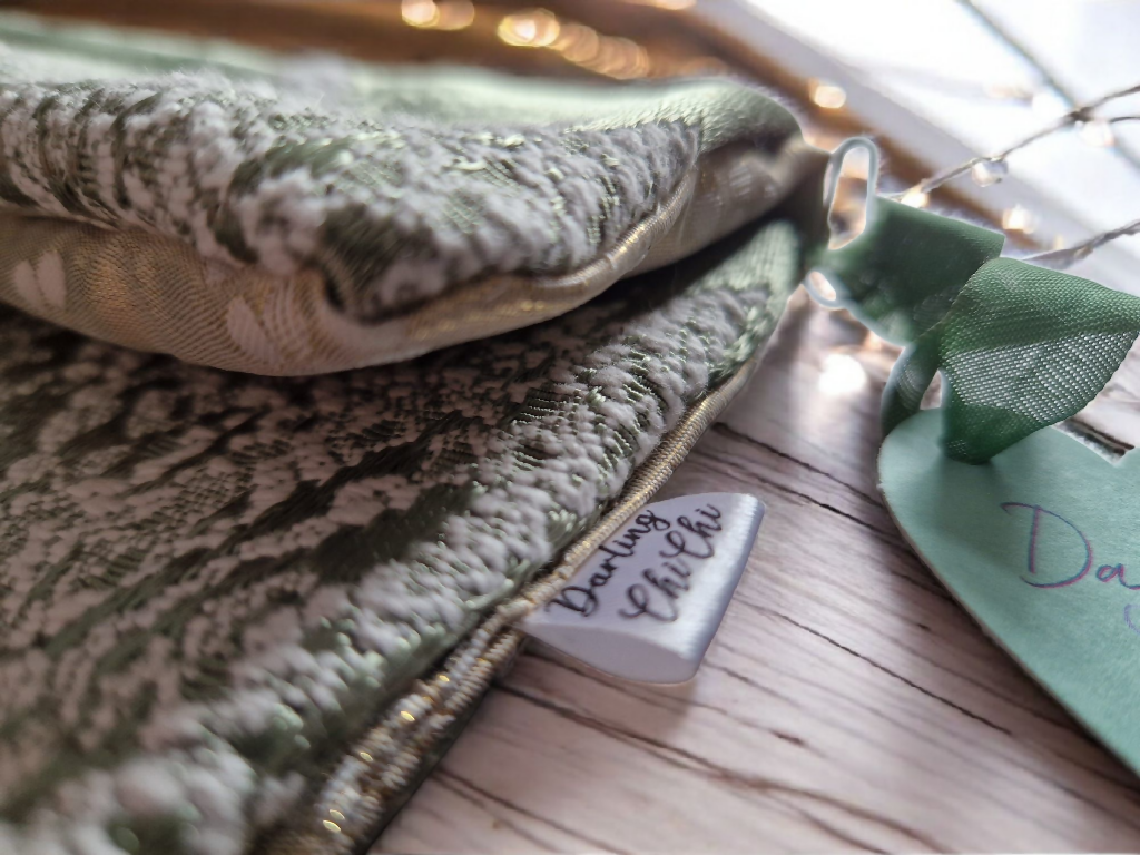 This upcycled satin embroidered fabric is crafted from reclaimed vintage curtains, lovingly transformed into a richly textured, eco-friendly material. The thick satin base featu...