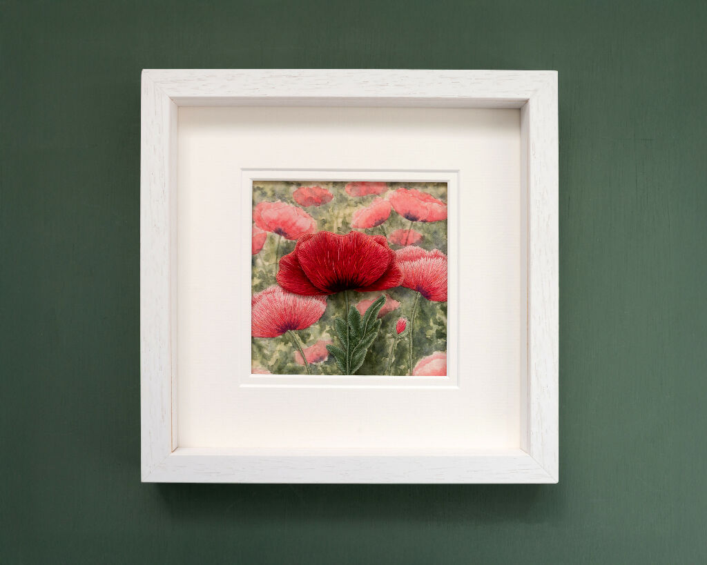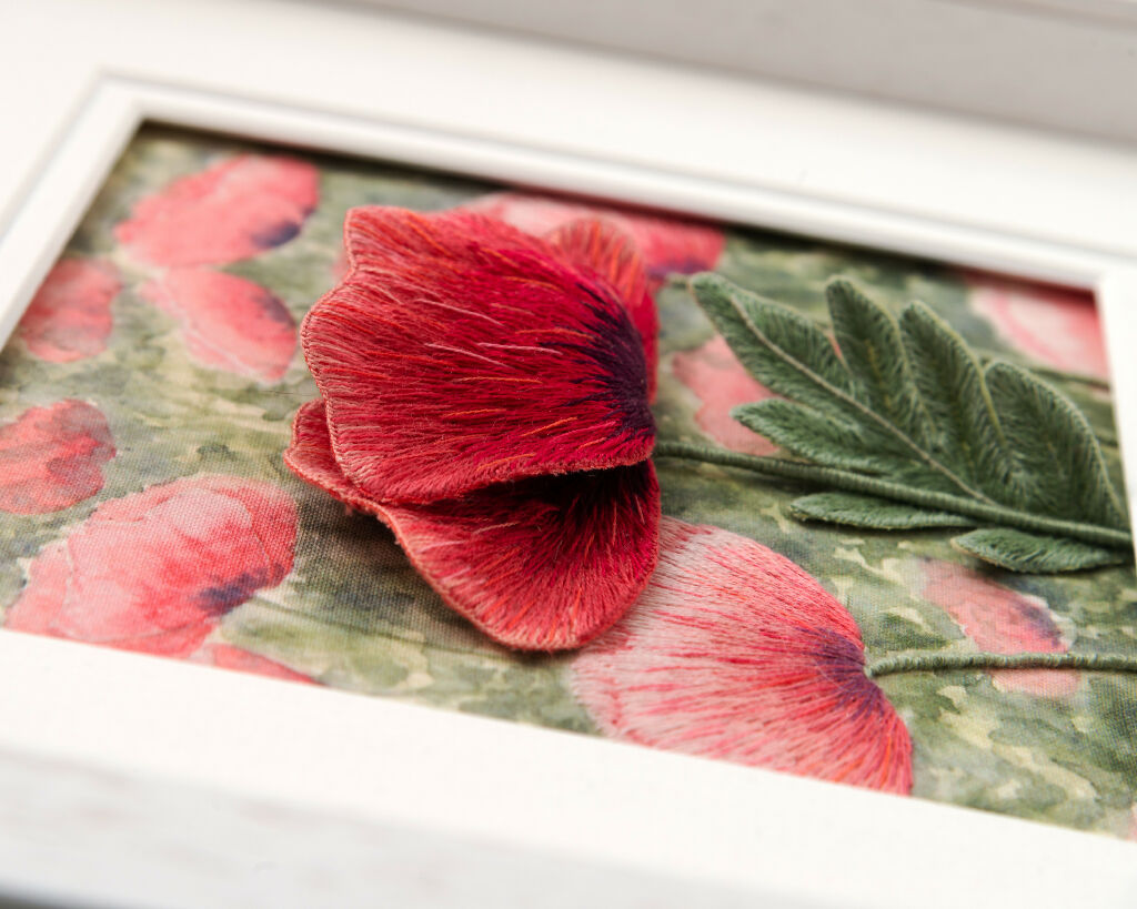 This surface and stumpwork embroidery features classic red poppies against a watercolour effect printed background.