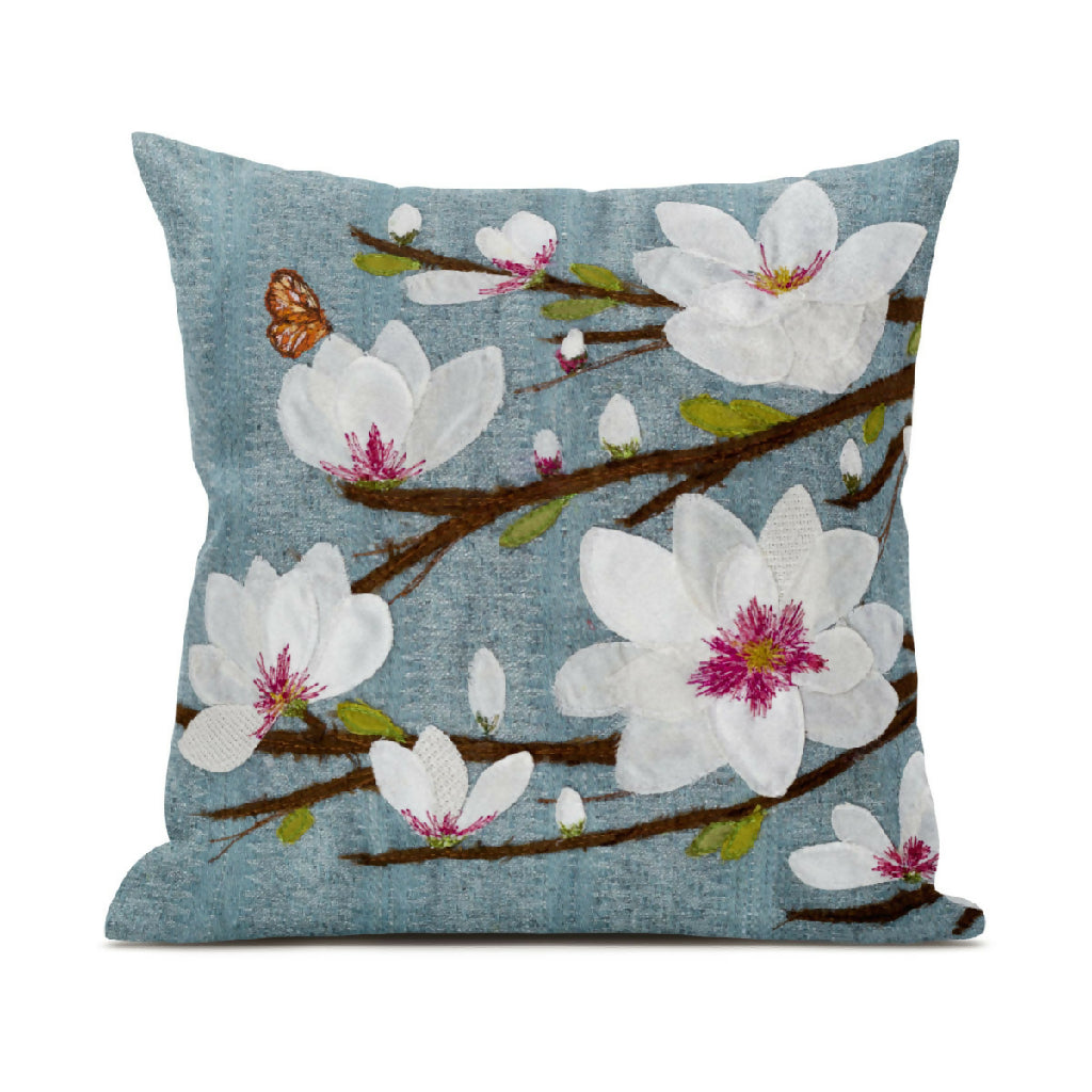 A beautifully soft faux suede cushion, which features an exquisite magnolia blossom design set against a serene soft blue background. Measures 44 x 44 cms. Includes cushion pad....