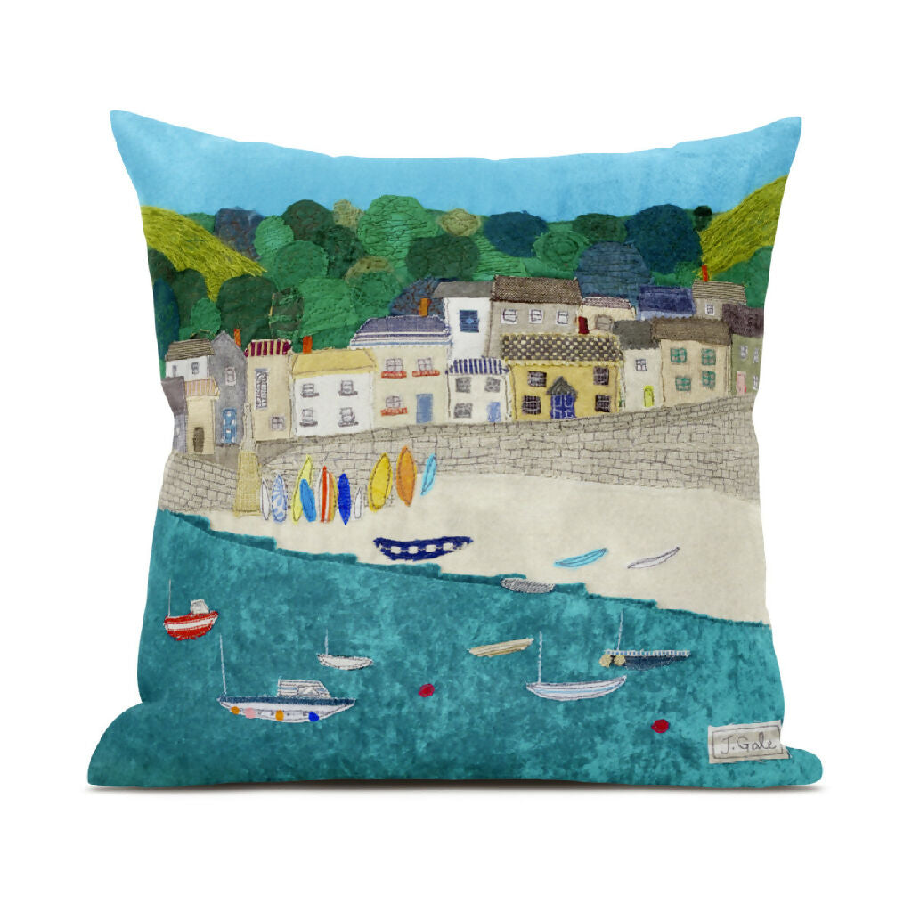 A beautifully soft faux suede cushion featuring the charming village of Mousehole in Cornwall. Designed by textile artist, Jackie Gale.