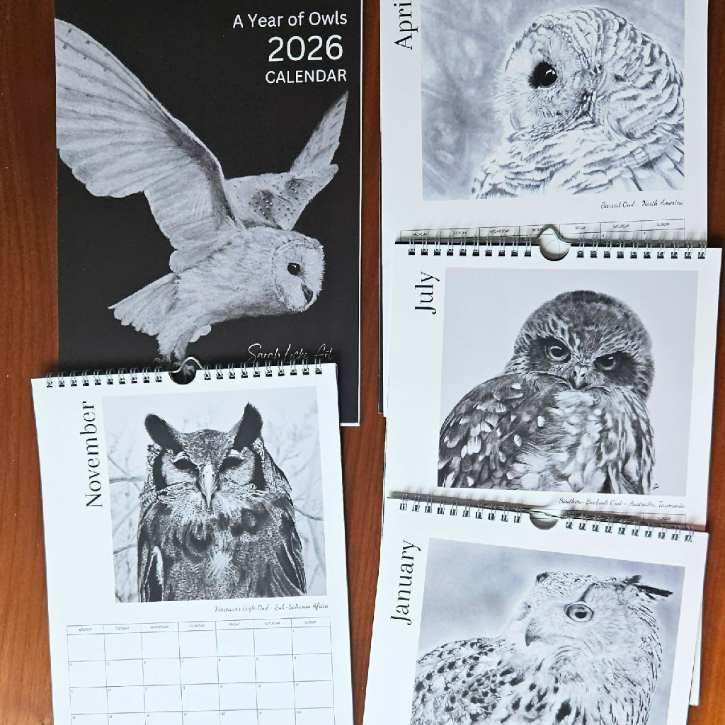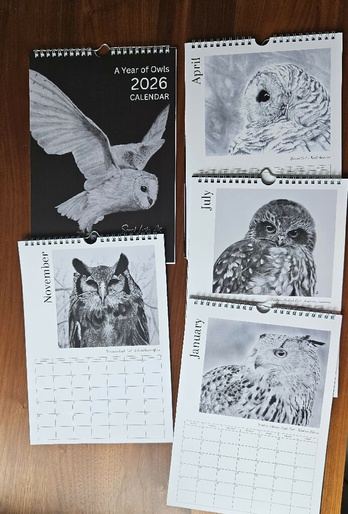 A collection of 12 owl drawings made into a calendar, all drawn from my own observations of owls, not copied from stock photos. Each month brings a touch of nature into your ev...