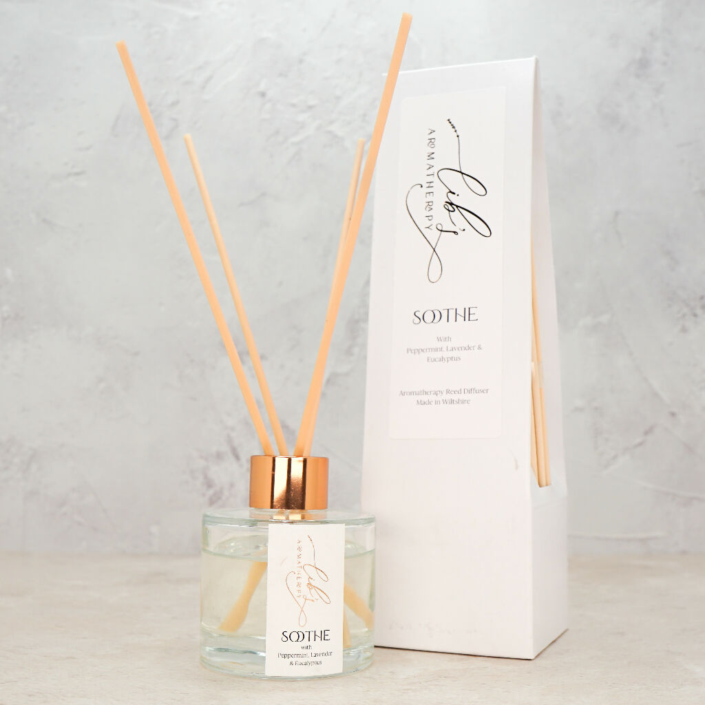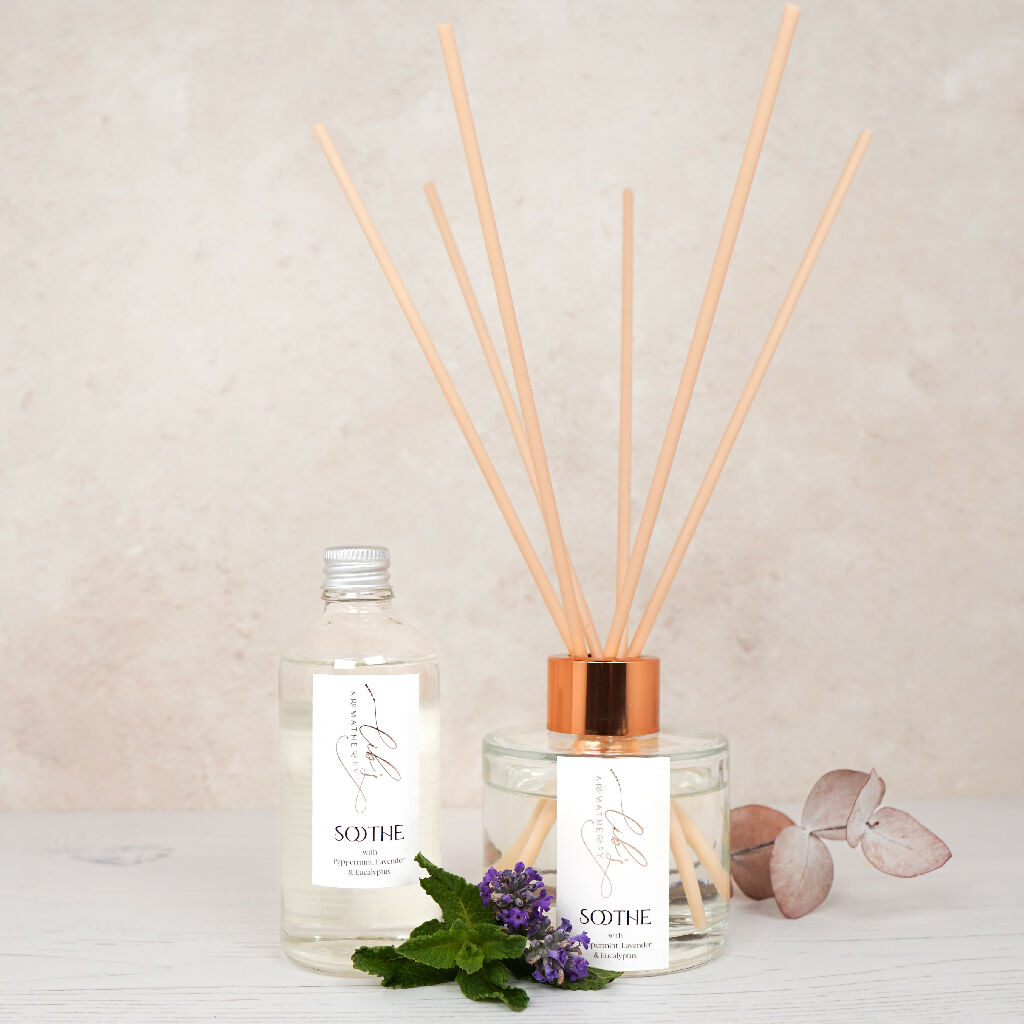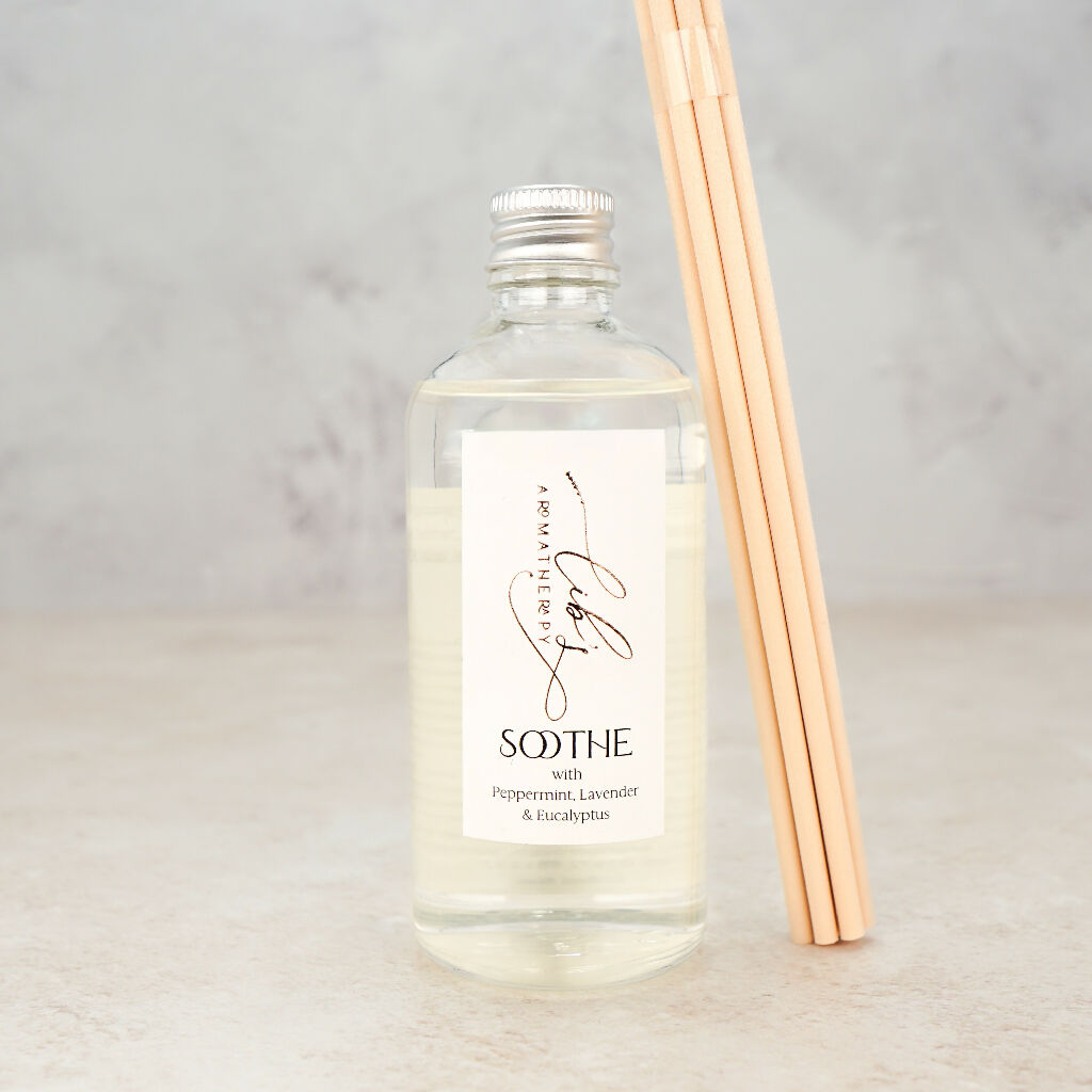 Handmade with pure essential oils, the Soothe Essential Oil Reed Diffuser has a fresh, cooling aroma of peppermint, lavender and eucalyptus. This natural blend clears the senses and refreshes the atmosphere, creating a calm and balanced space.