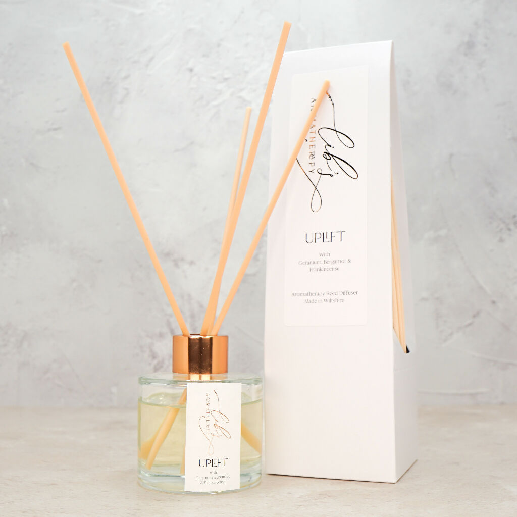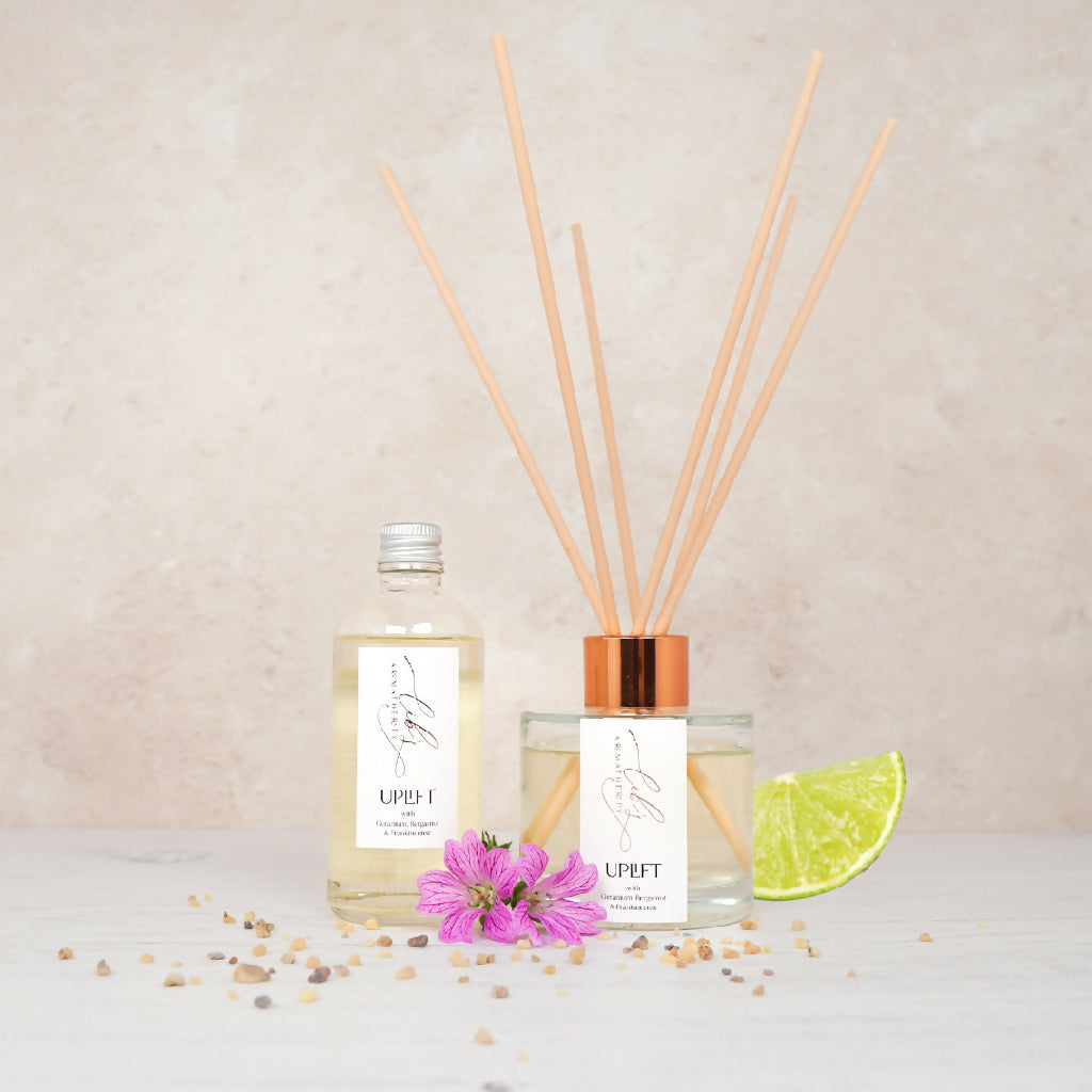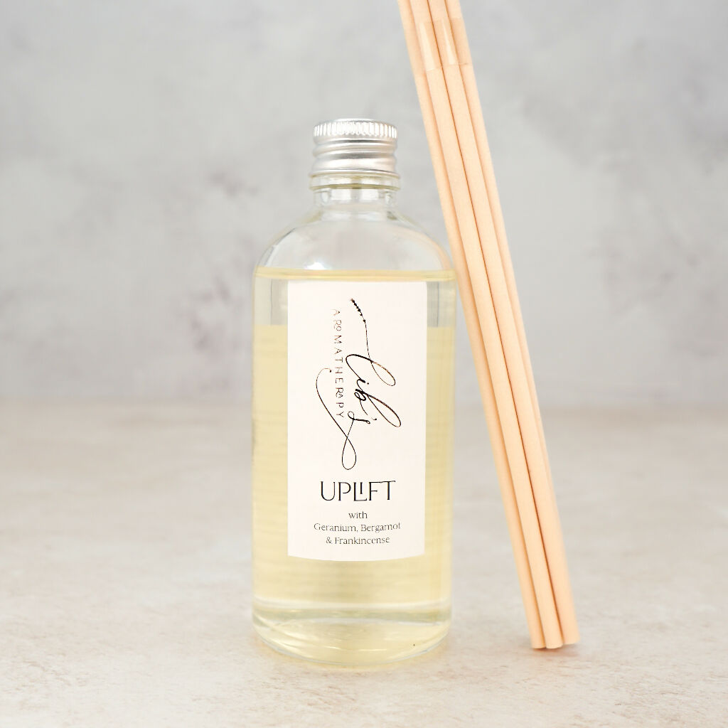 Handmade with pure essential oils, the Uplift Essential Oil Reed Diffuser fills your home with a bright, floral-citrus aroma of geranium, bergamot and frankincense. This natural blend brings lightness, clarity and positivity to any room.