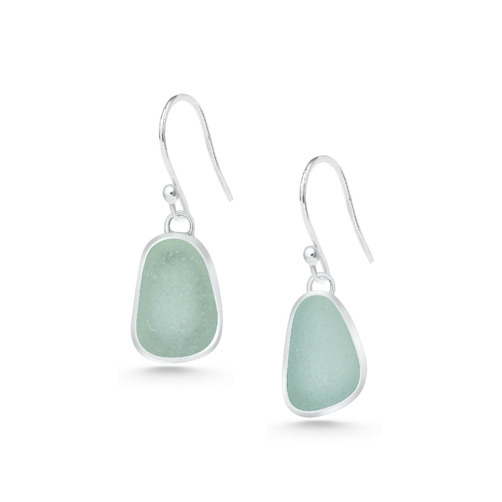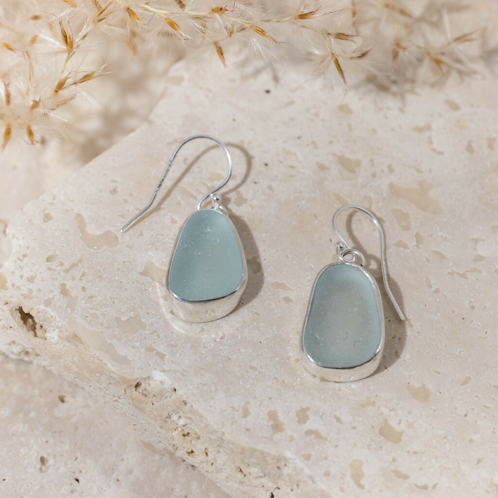 These beautiful dangle earrings feature aquamarine blue sea glass, forgaed from a Kent beach. Each sea-worn pebble has been naturally tumbled by the waves over the years, creating a beautifully smooth texture—what I like to call ‘gemstones of the sea.’