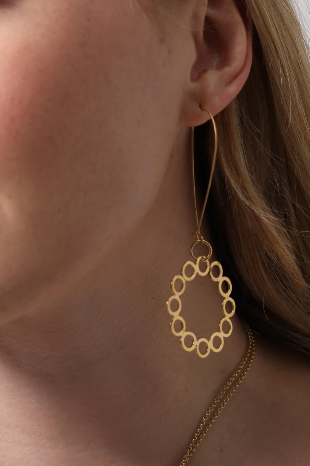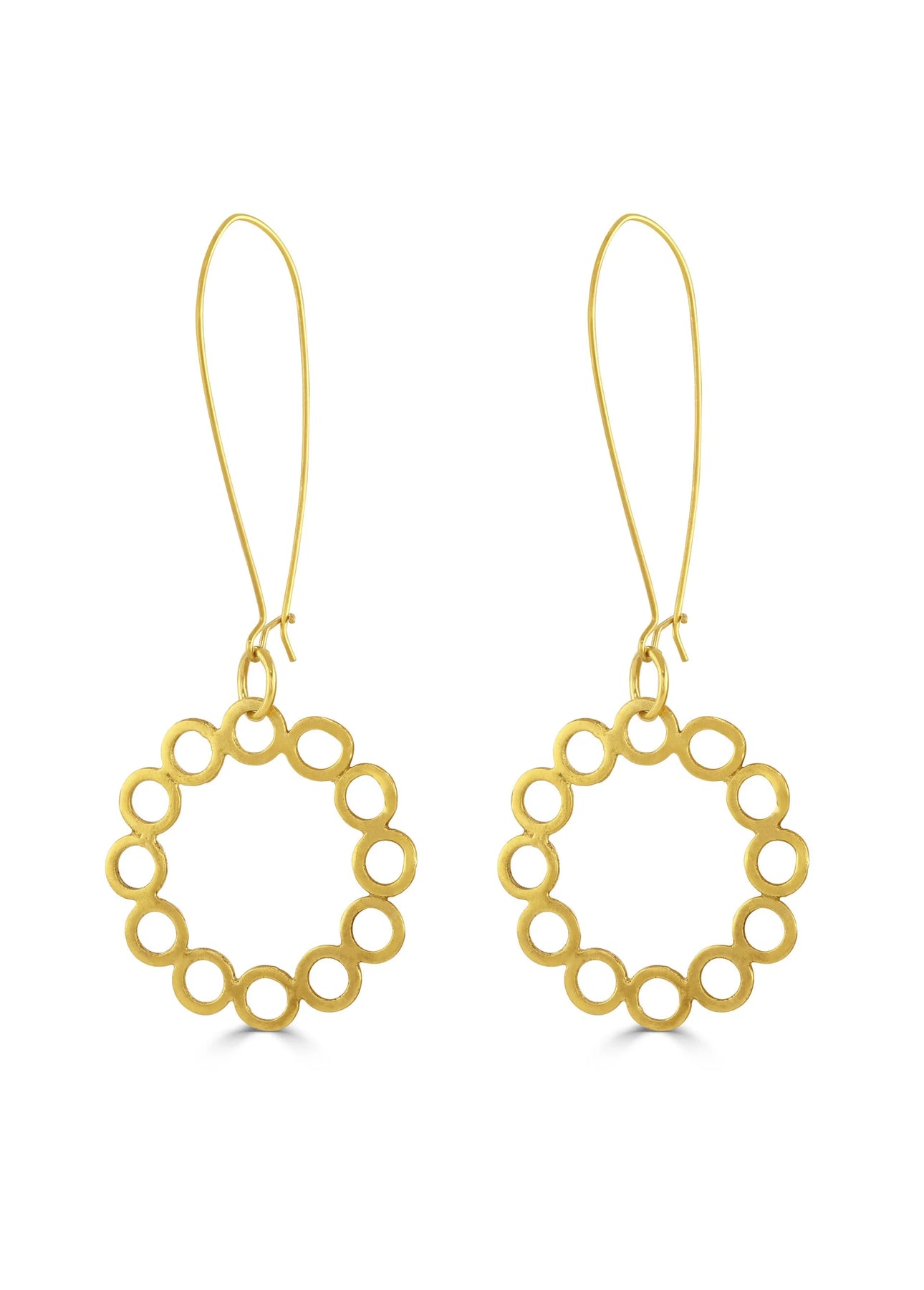 A beautiful circle dangle earring made of lots of little circles with a classic but modern twist.