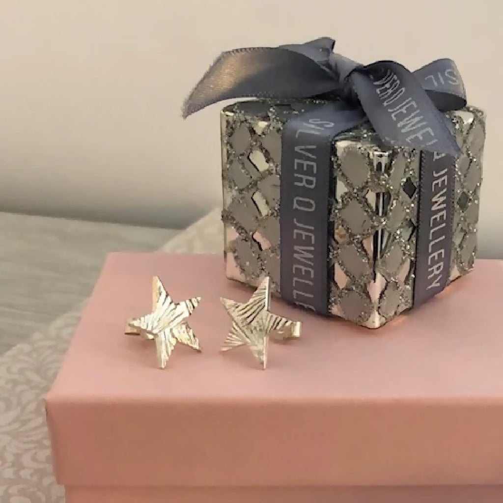 A lovely sparkly pair of Star studs, handcrafted in fine silver with sterling silver posts and scrolls. The sharply textured finish gives a glittery finish, catching the light to add a sparkle to the festive season ... and beyond.