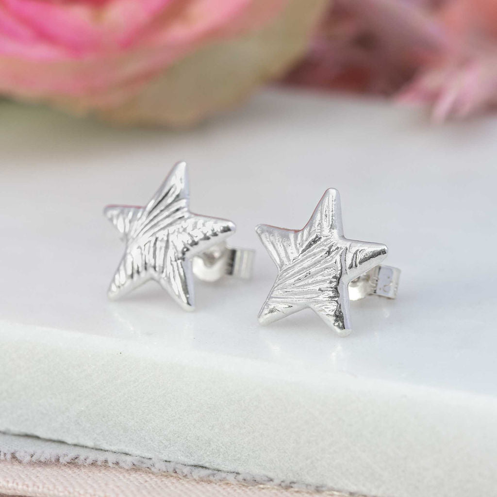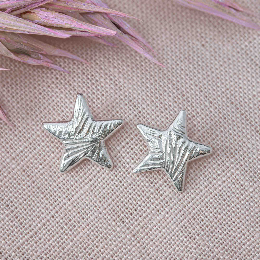 What a lovely way to sparkle and shine! These handcrafted little star ear studs are made from fine silver. They have a geometric style texture and a highly polished finish so the are designed to twinkle in the sunlight! The posts are made from sterling silver as are the scrolls.