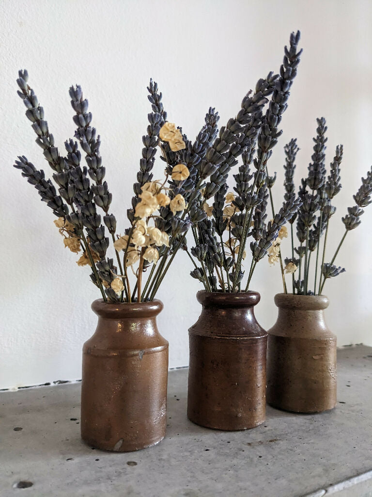 Timeless and understated, this set of three vintage stoneware ink pots brings rustic charm to any space. Each pot is unique in tone and texture, filled with a thoughtfully arranged selection of dried flower stems for a naturally elegant display. Whether styled on a shelf, desk, or windowsill, they offer a quiet beauty that complements both modern and traditional interiors.