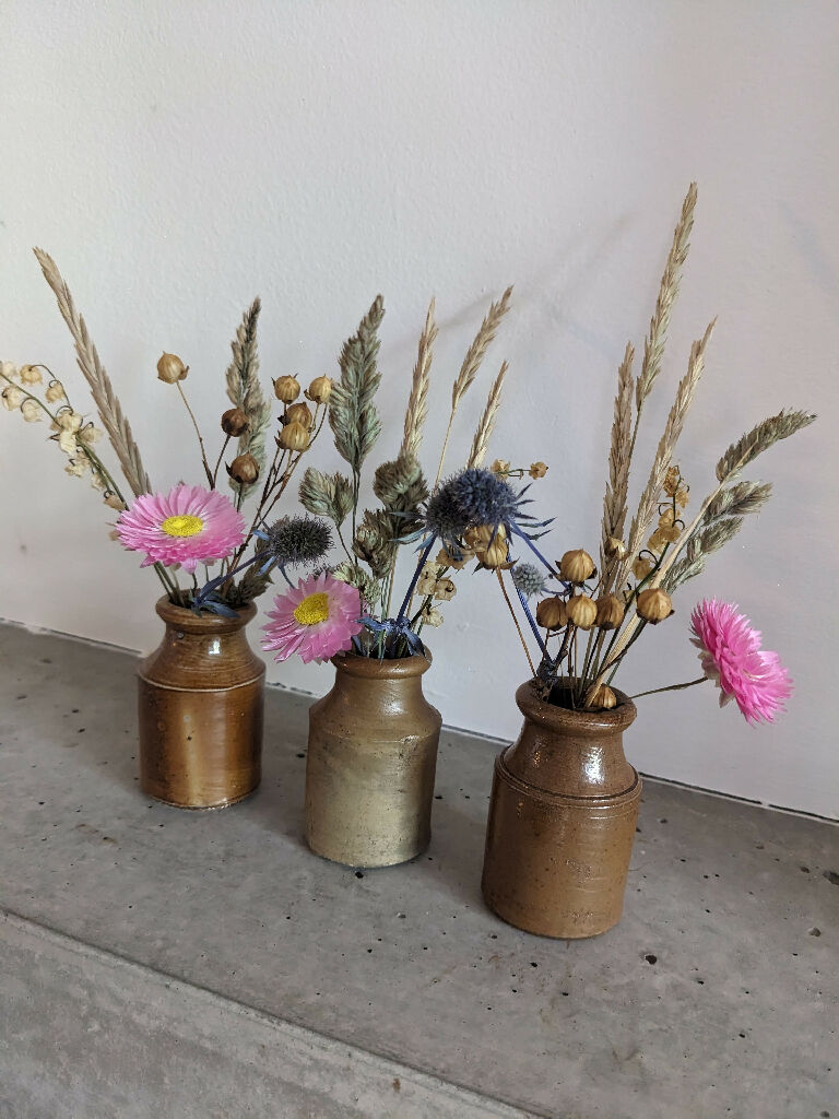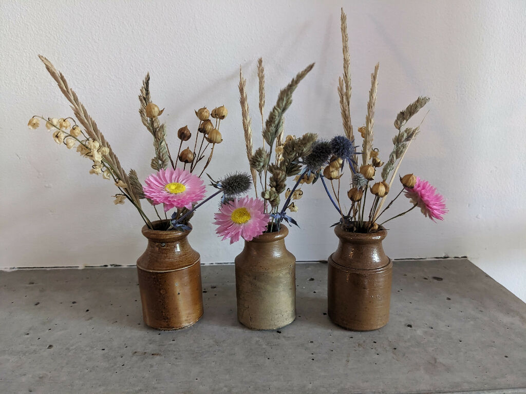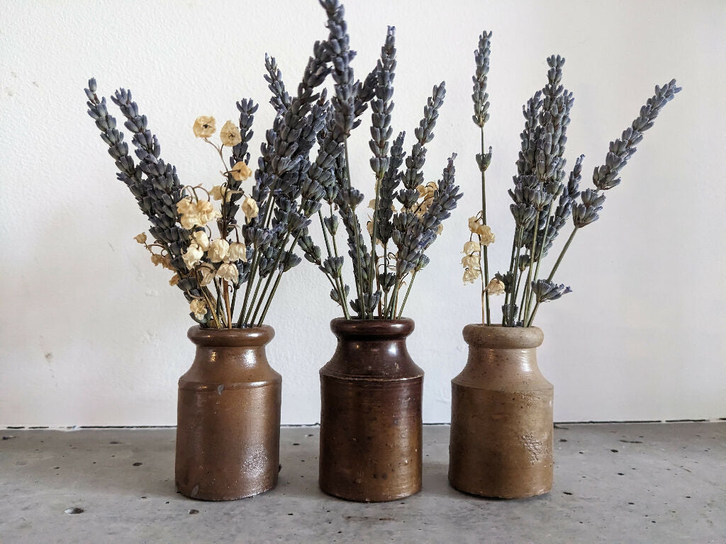 Set of 3 Vintage Stoneware Ink Pot Vases with Dried Flowers