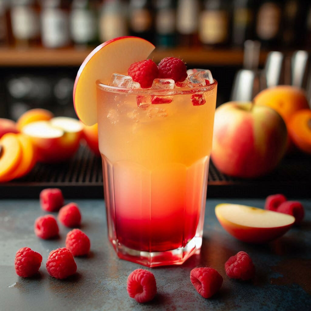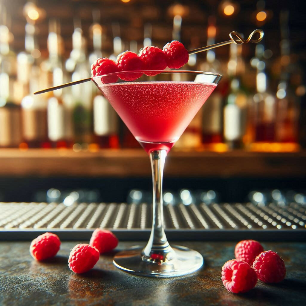 Shake over ice and serve in a Martini glass with a Raspberry spear.