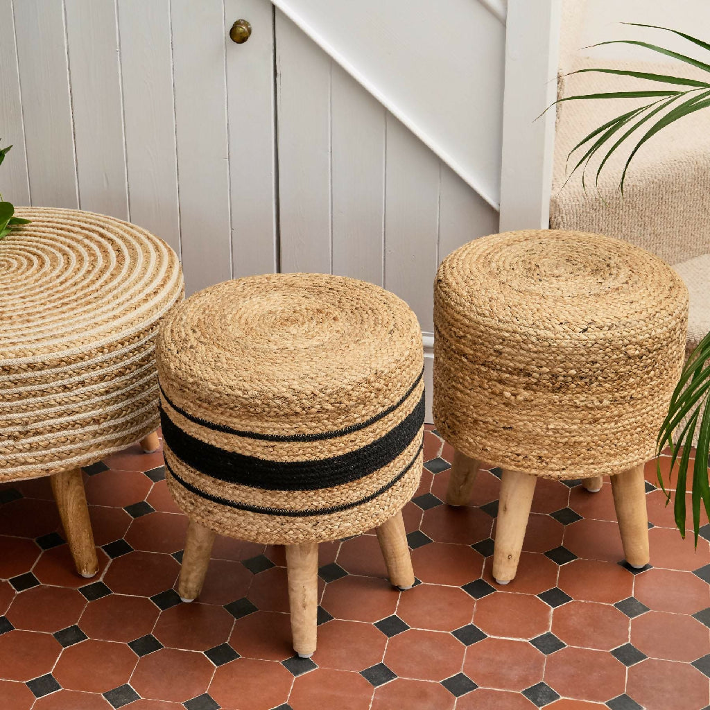 Discover our EcoBlend Jute Footstool, crafted with a mix of Indian mango, poplar, and Kail wood for the base and legs.