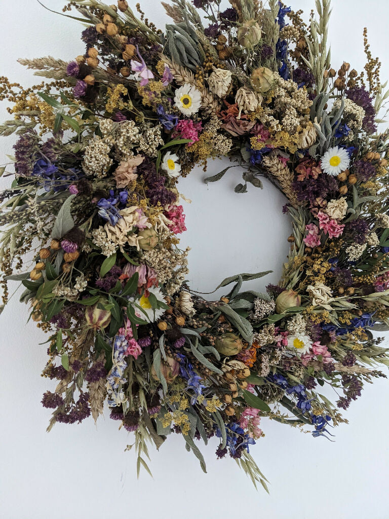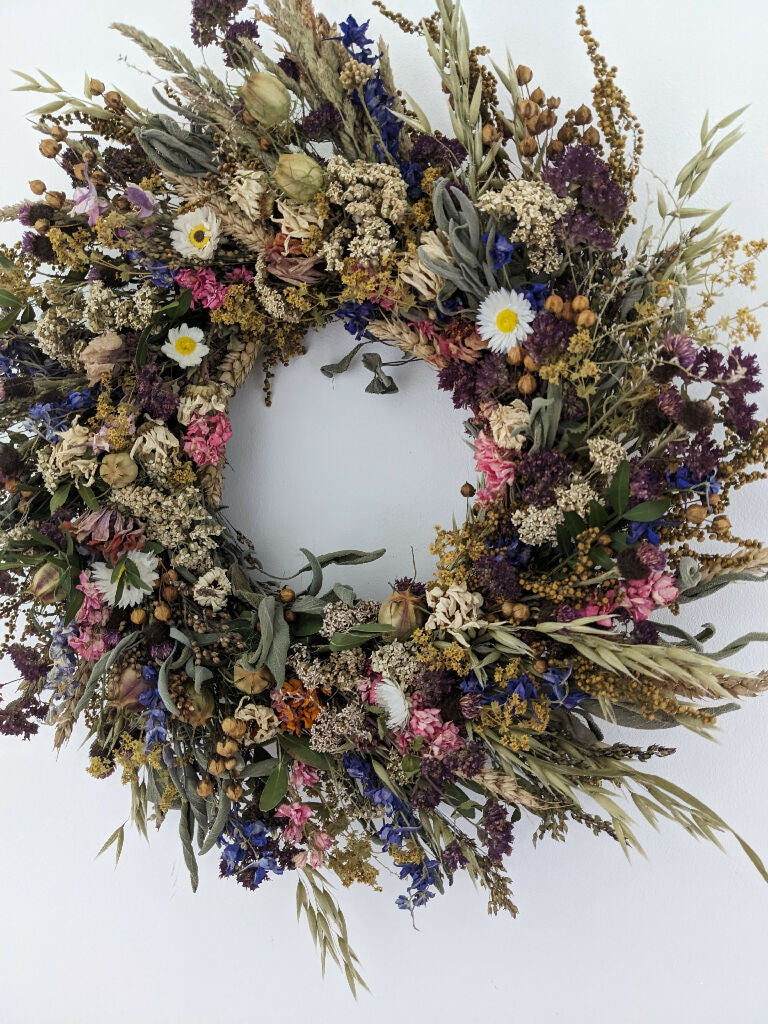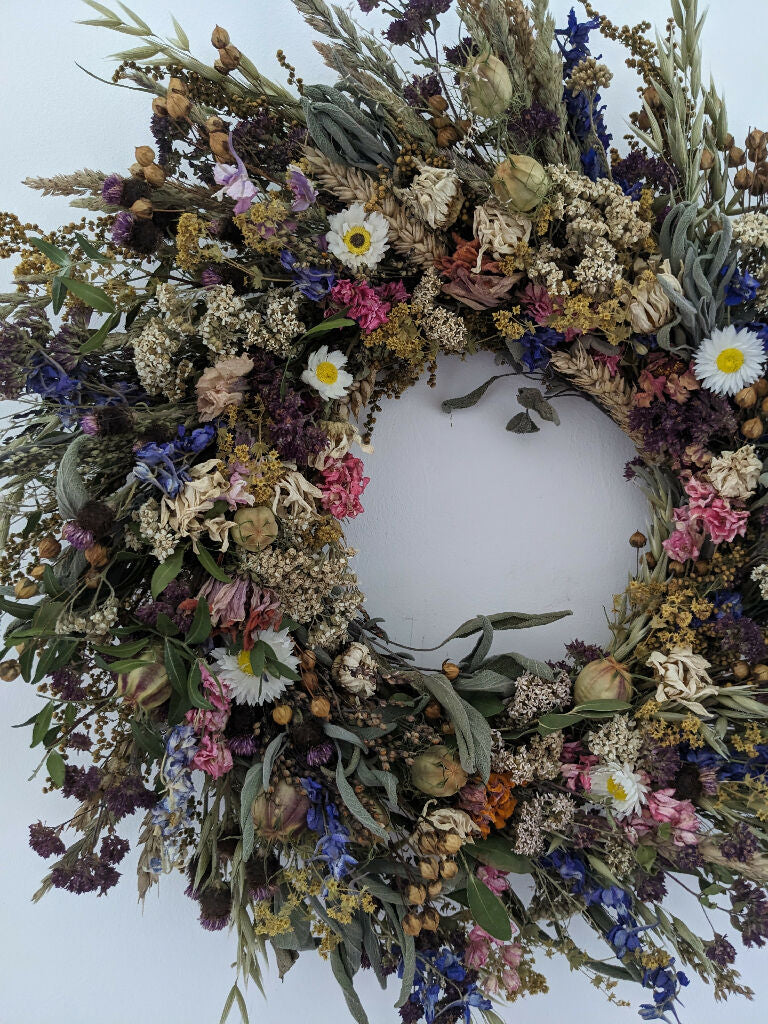 A beautiful handmade wreath inspired by the English countryside, crafted from a mix of organically grown and foraged flowers gathered in West Sussex.
