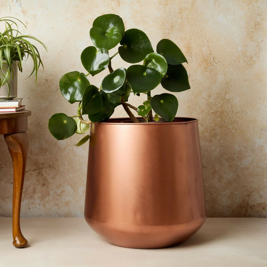 Enhance your greenery with our Tamra Copper Floor Planter. Designed with a graceful belly shape that gently curves toward the base, this planter provides added stability for large or heavy plants while remaining lightweight thanks to its durable iron construction. The elegant copper tone adds warmth and sophistication, making it a beautiful statement piece in any interior.