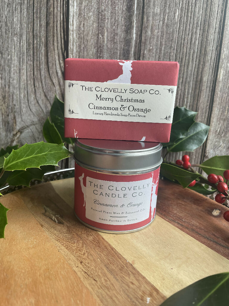 Handmade Cinnamon & Orange 100g Soap Bar wrapped in festive paper with a Merry Christmas Label and Matching Cinnamon & Orange Large Tin Candle Hand poured using Soya Wax and Essential oils. Perfect Hostess Gift for friends and Family or to make your own home Christmas Ready.