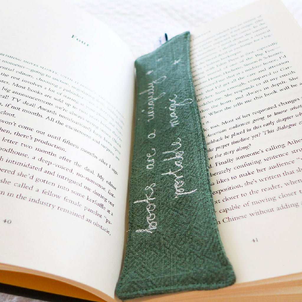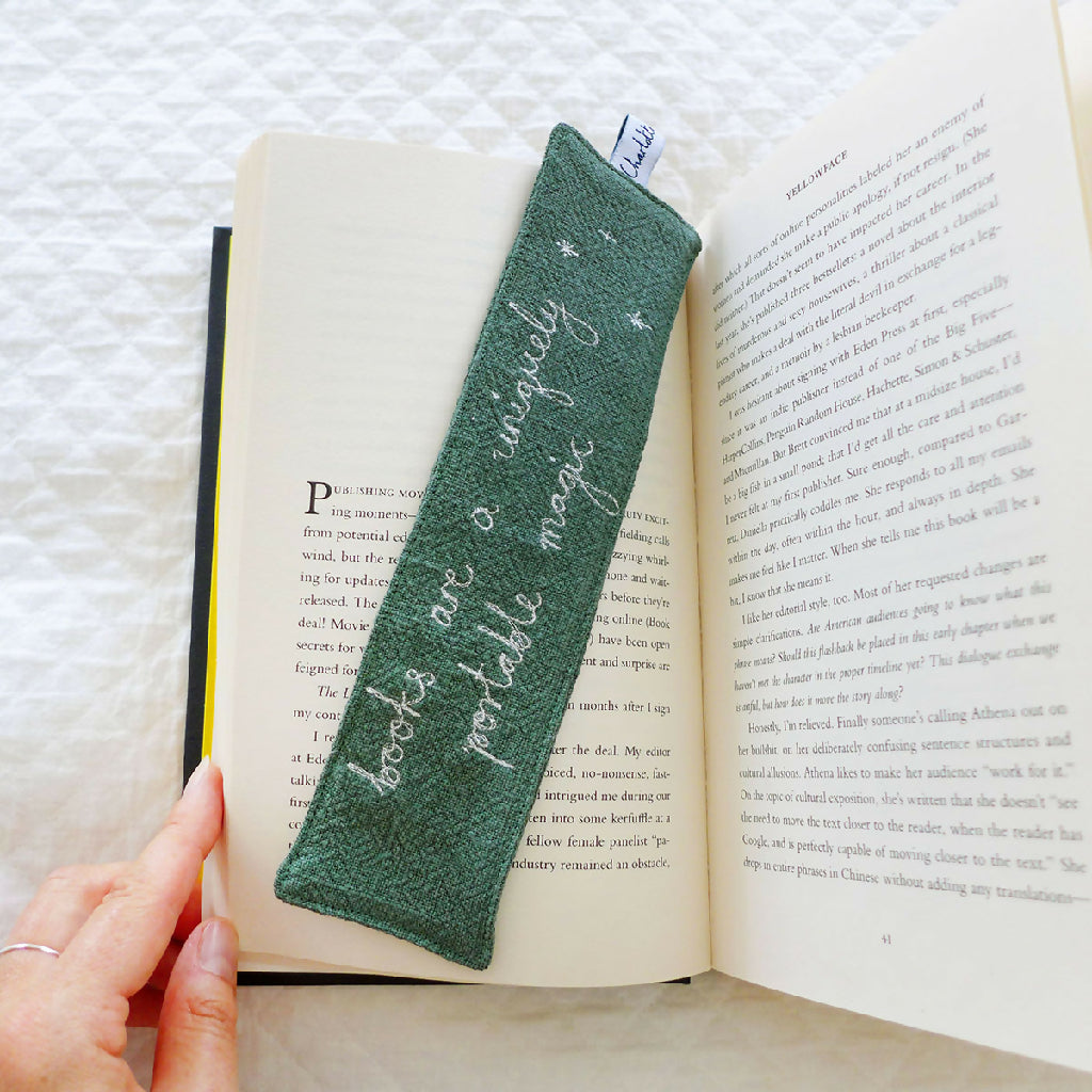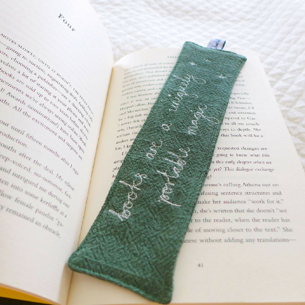 A textured green cotton bookmark with embroidered 'books are a uniquely portable magic' handwriting.