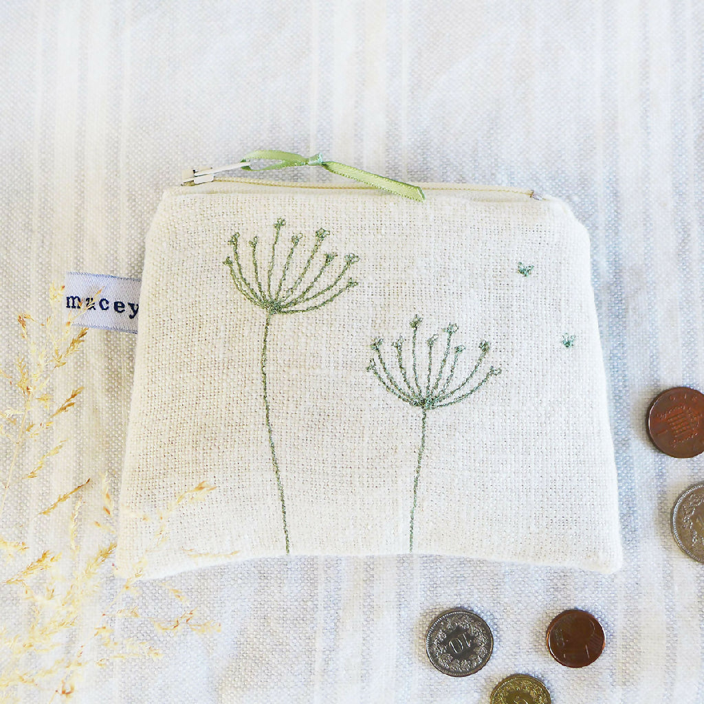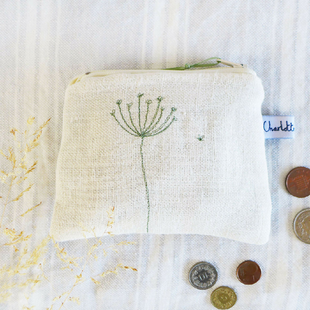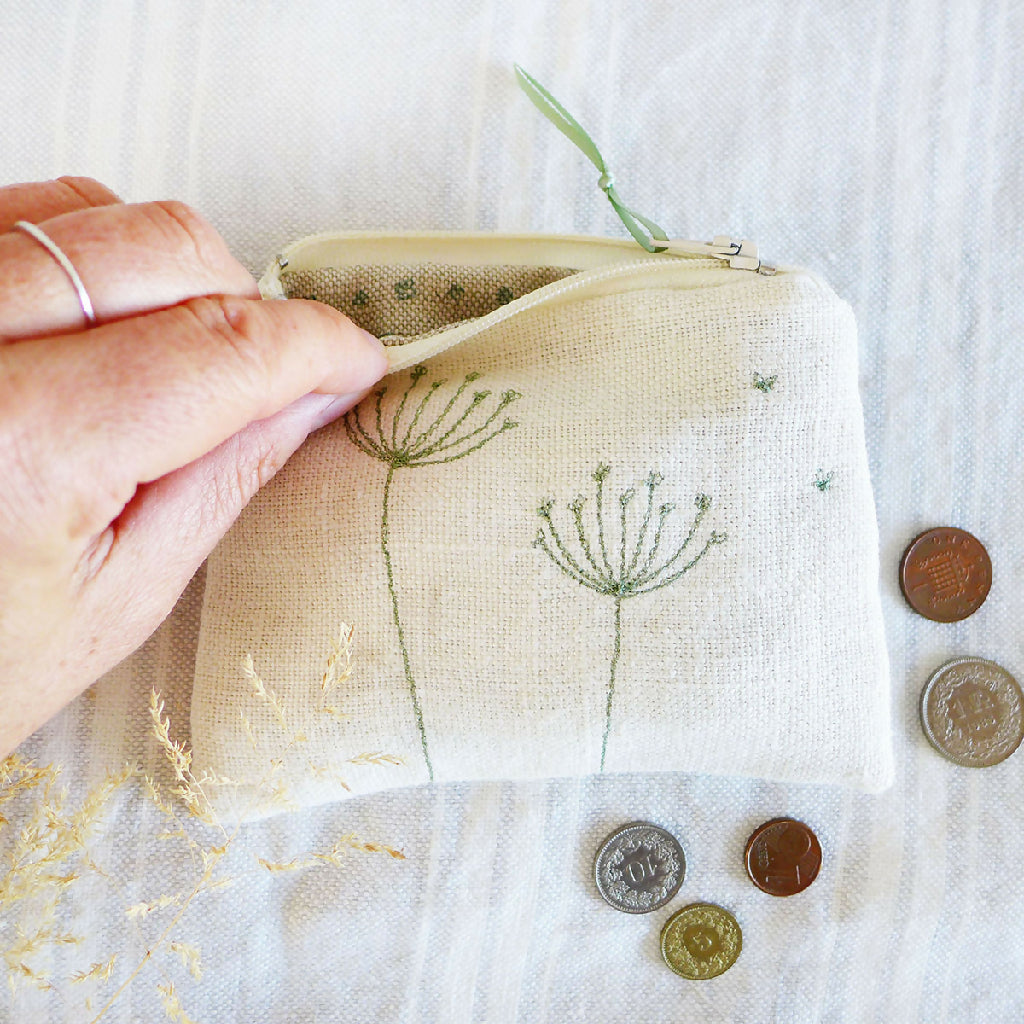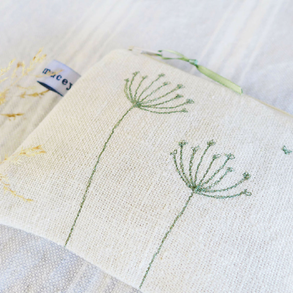 Charlotte brings swaying stems of cow parsley to life through her embroidered illustrations. Each stem of cow parsley will be unique, due to the nature of her freehand embroidery. Stitched in soft green cotton thread, contrasting with the ivory linen of the purse.