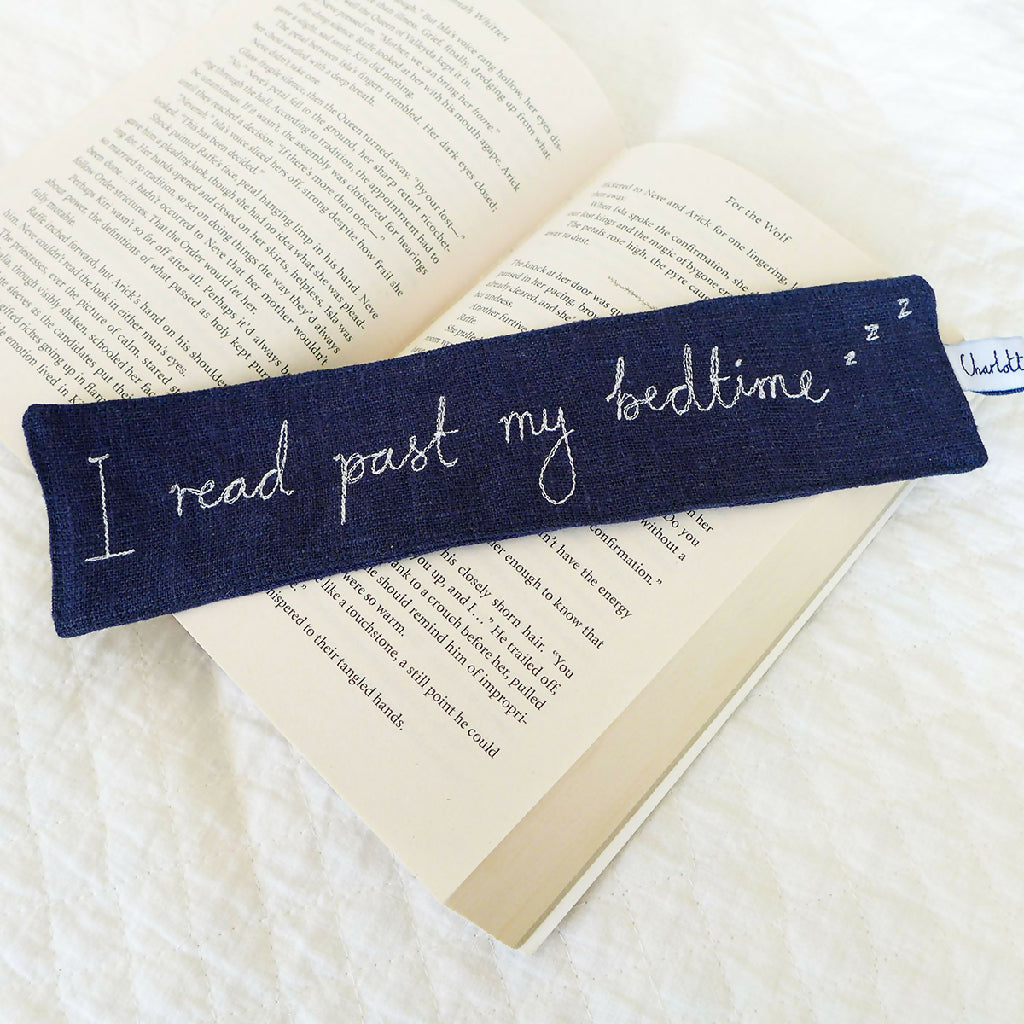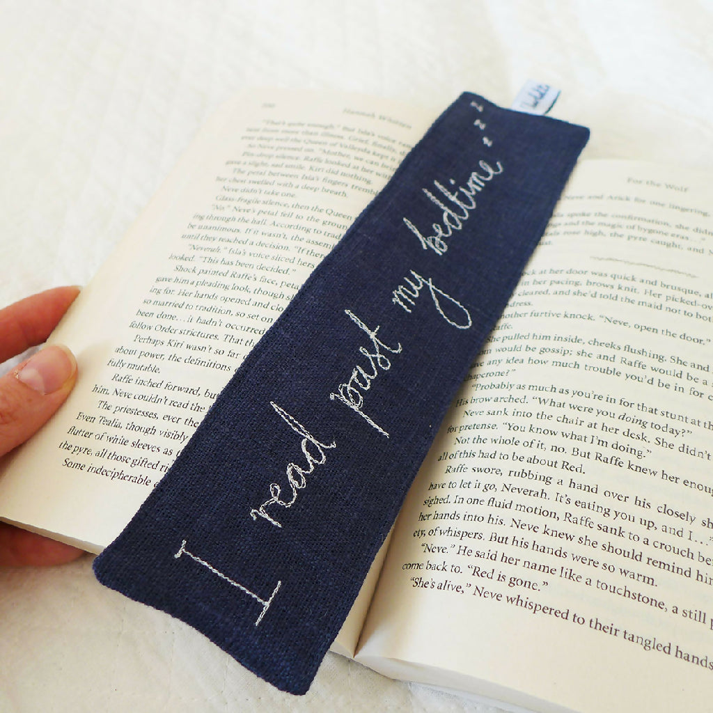 A navy linen bookmark with embroidered 'I read past my bedtime' handwriting.