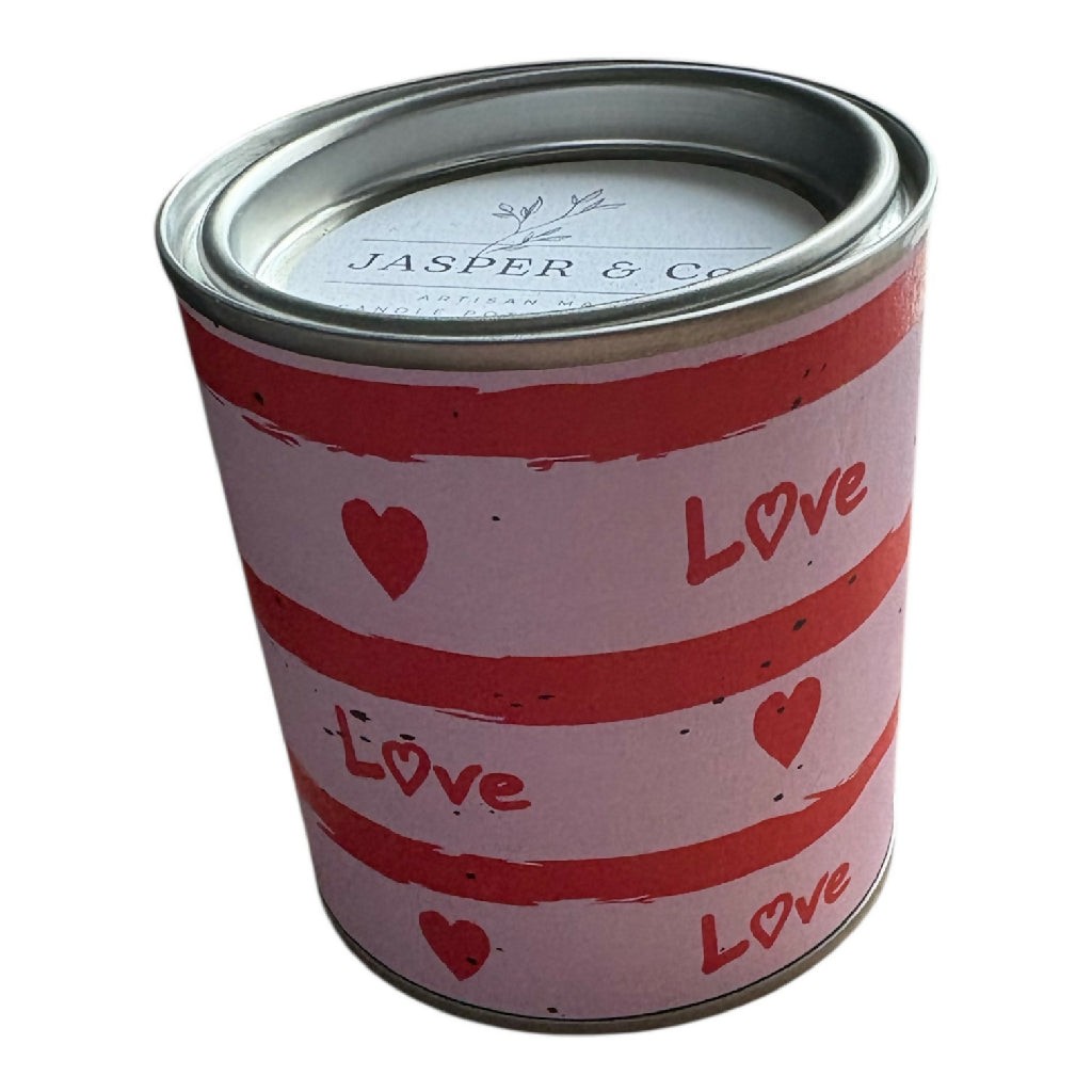 Create a warm, romantic atmosphere with this beautifully designed love-themed candle tin. Wrapped in soft pink tones with hand-painted red stripes, hearts, and “Love” lettering, this candle adds a charming decorative touch to any space. The modern metal tin with a secure lid makes it perfect for gifting, travel, or stylish home décor.