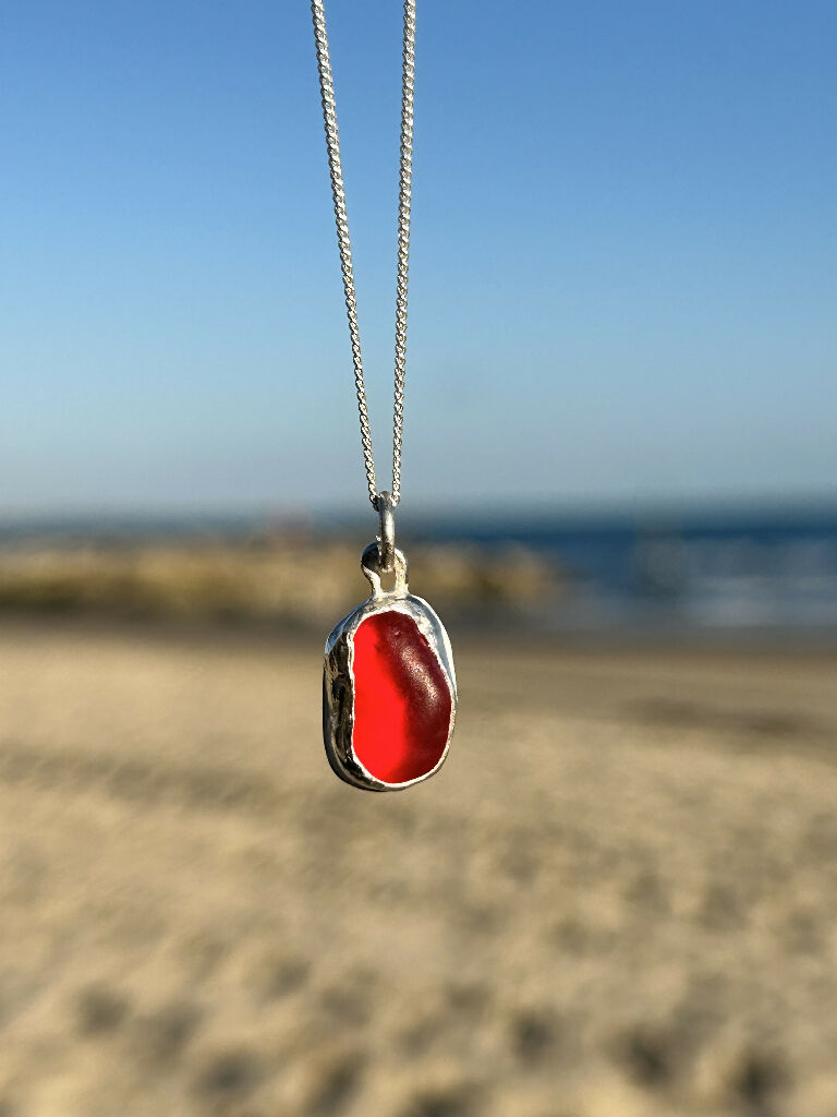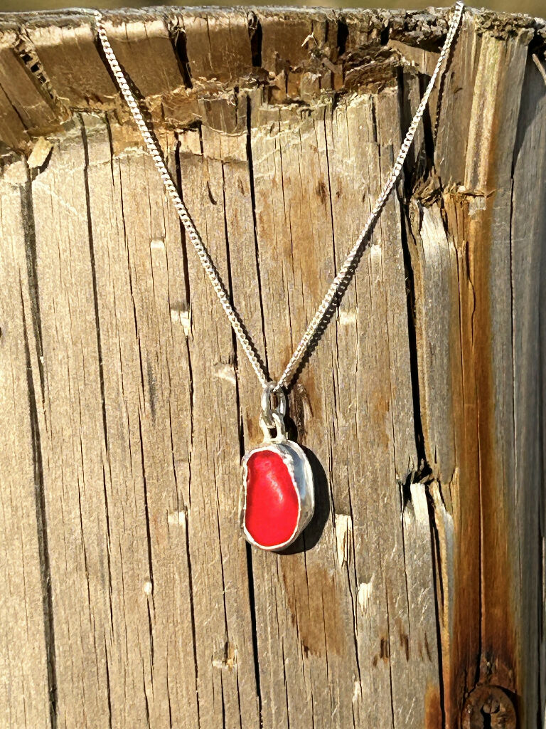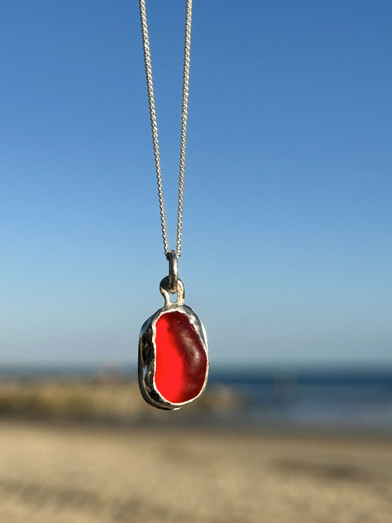 Seaglass necklace A very rare fund. A red piece of Seaglass, set by hand in a silver bezel.Comes on a silver chain 16” silver chain Other chains can be ordered on request Ins...
