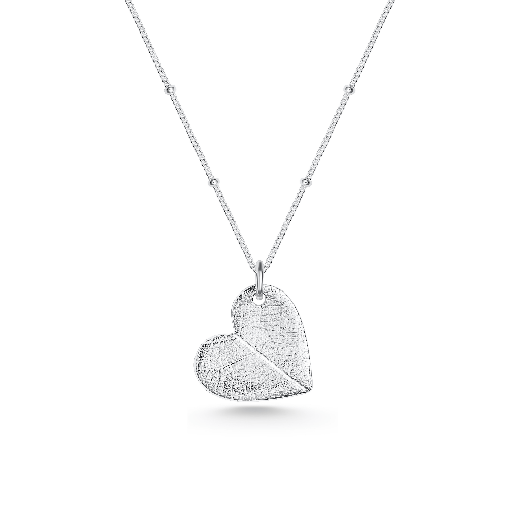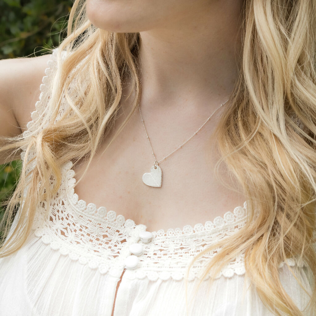 This heart shaped pendant has been textured using a natural leaf skeleton imprinted into fine silver clay. The recycled silver clay is then kiln fired to form solid silver, attached to a jump ring, and polished ready for wear.