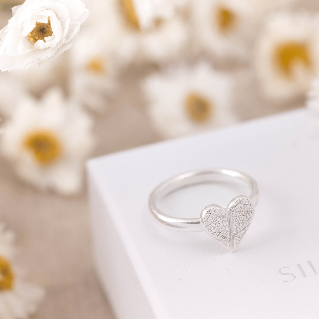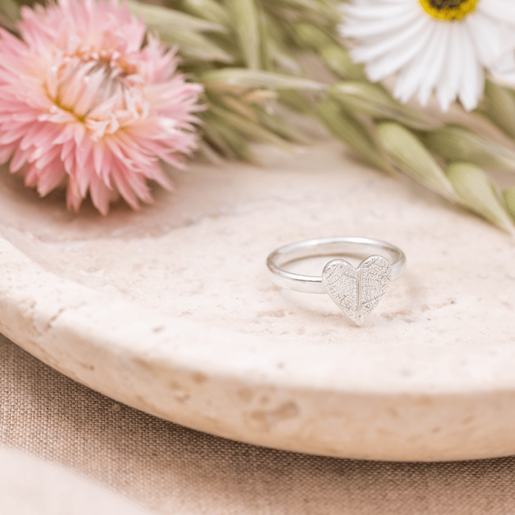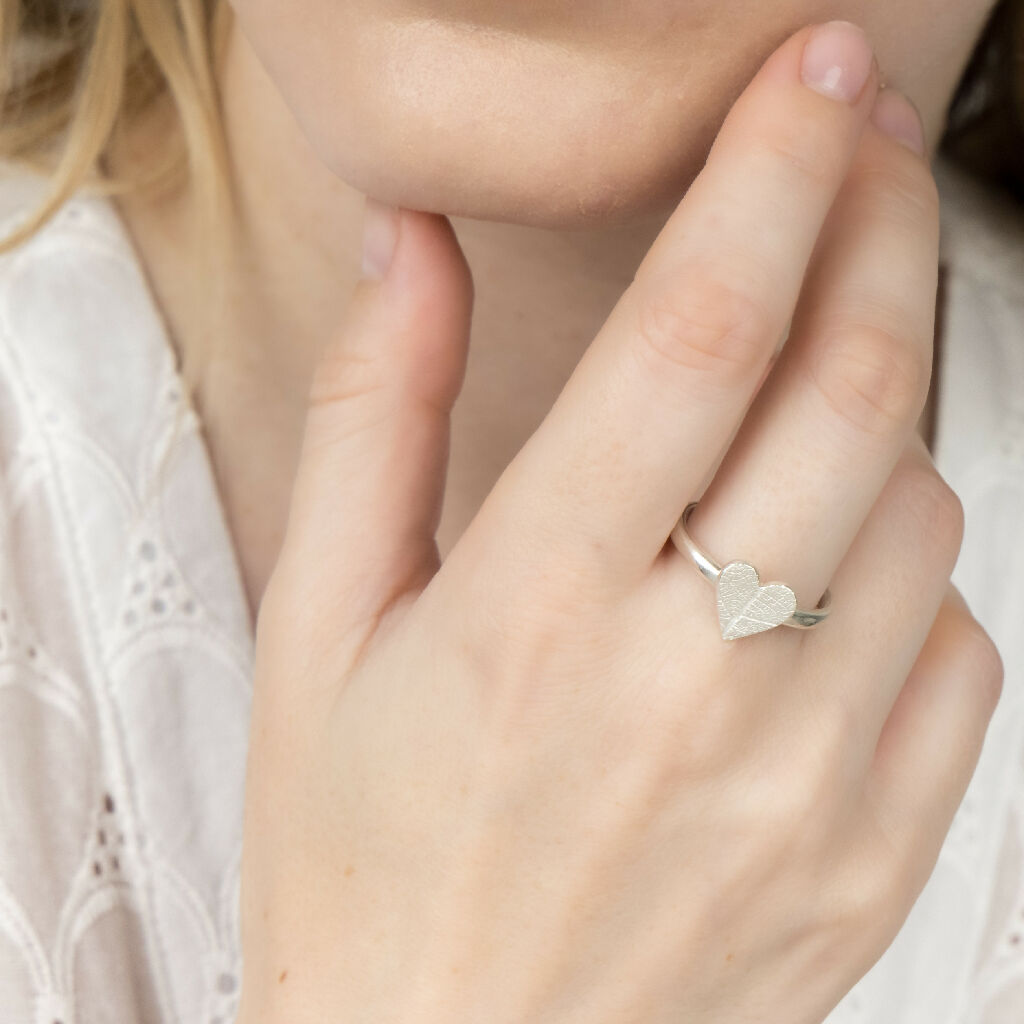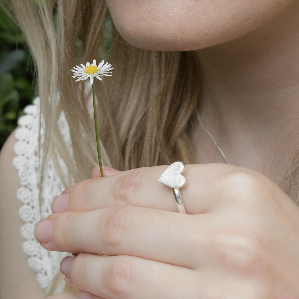 This pretty, romantic silver heart ring is decorated with a natural leaf skeleton texture. The leaf print is impressed into fine silver clay and cut into a cute heart shape. The...