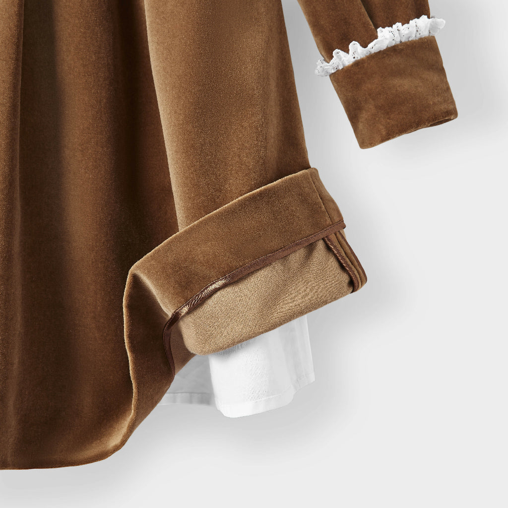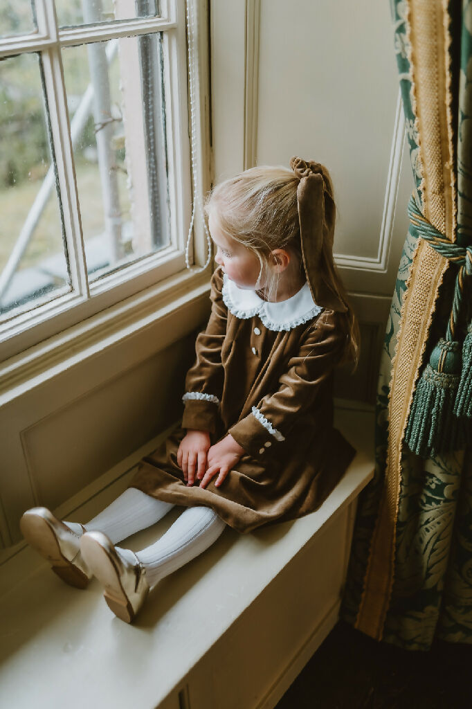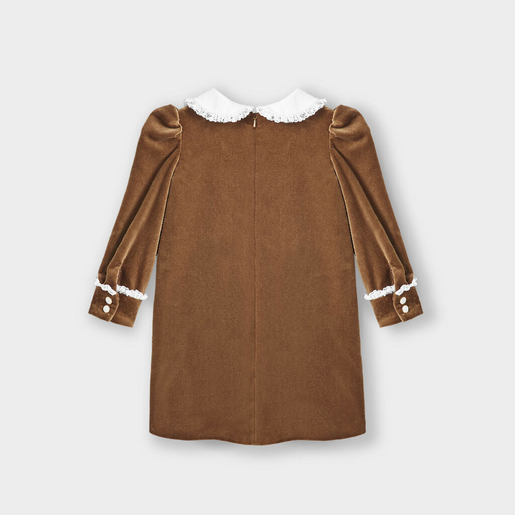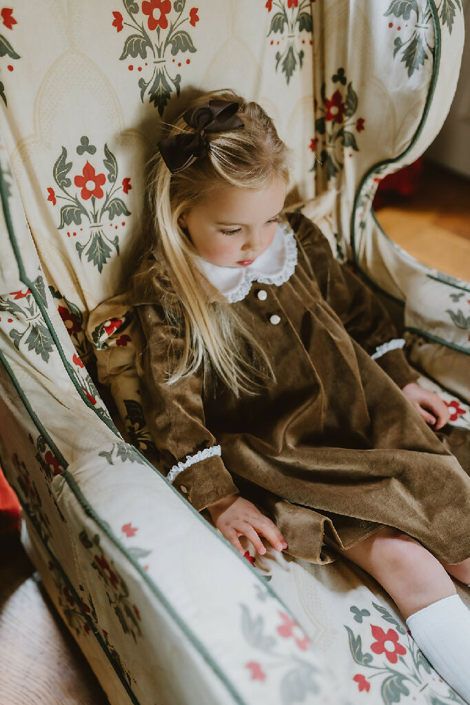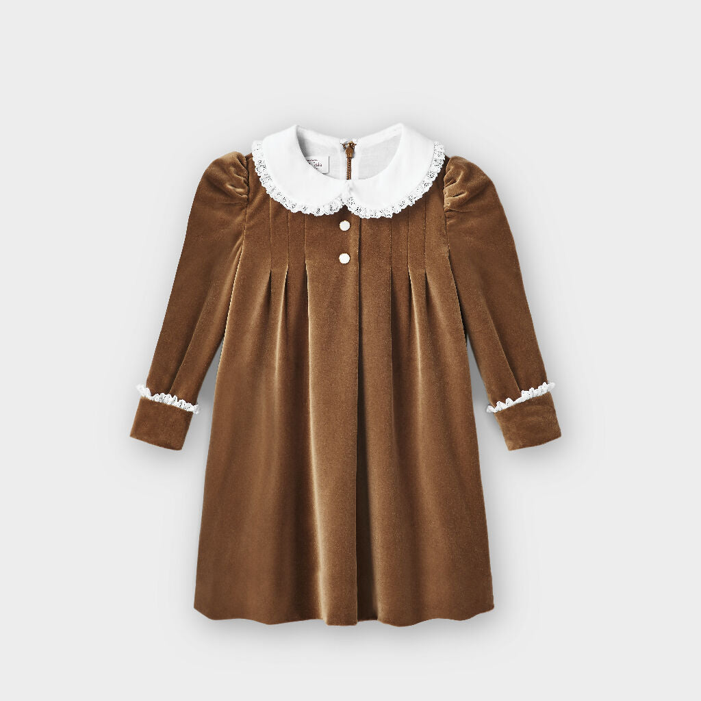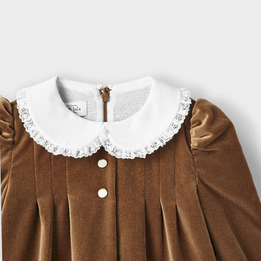 The most regal of all fabrics our classic Lace Trimmed Velvet Gown dress features an elegant peter pan collar trimmed with British lace that’s makes it perfect for special occas...