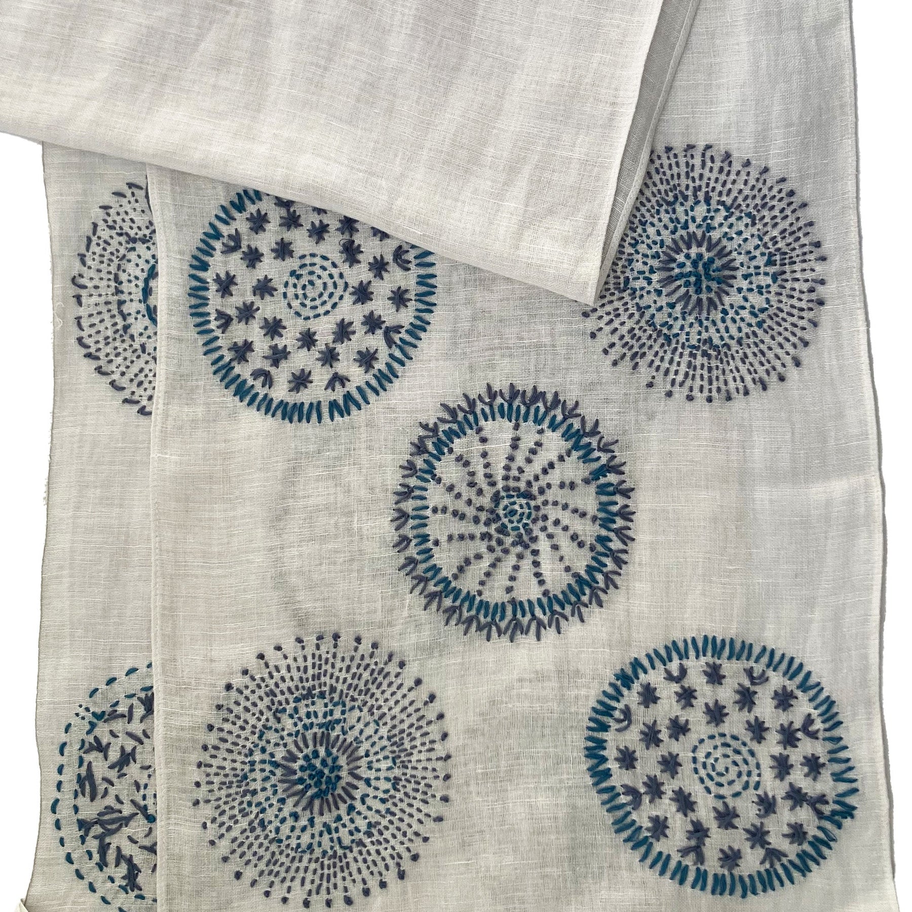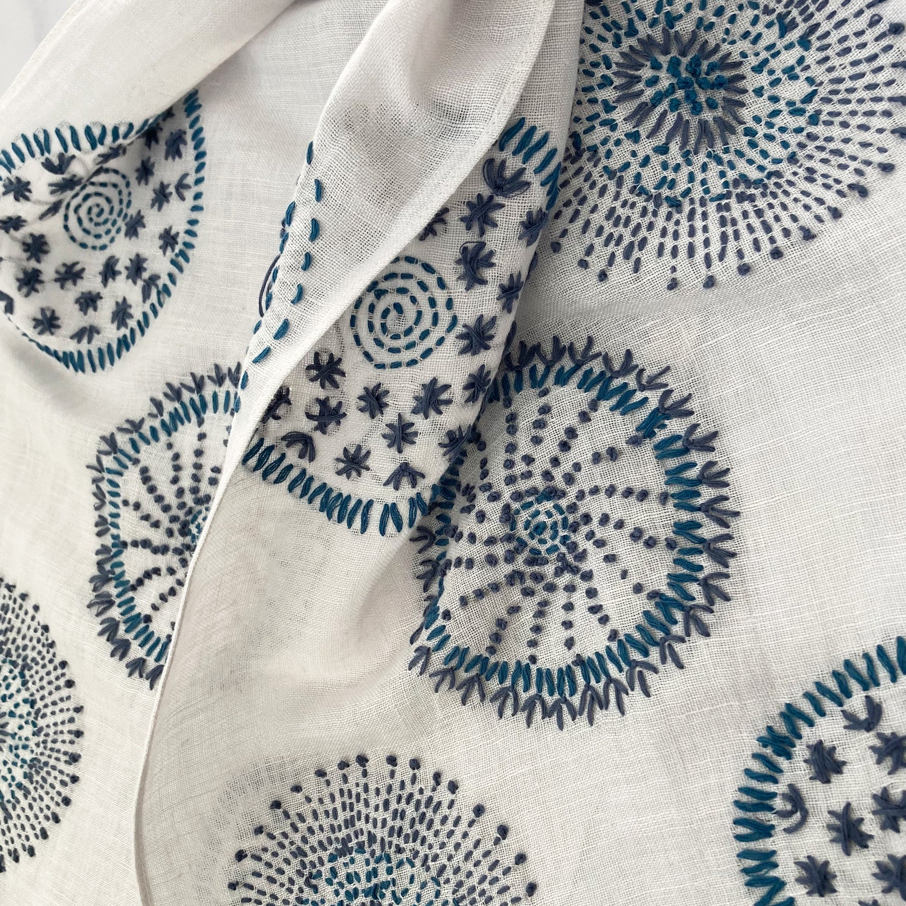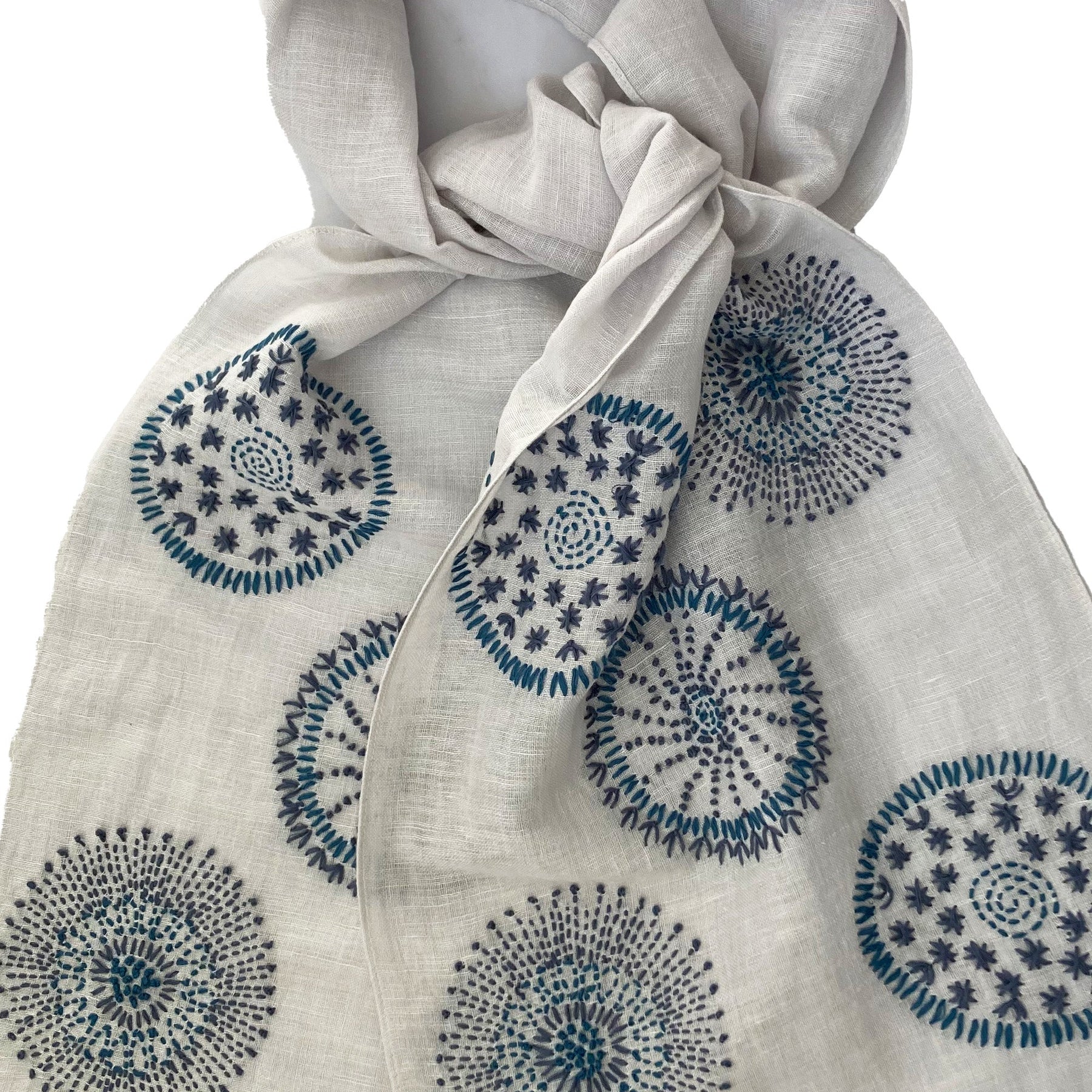 Crafted from high-quality 100% cotton linen, this exquisitely soft scarf showcases fine hand embroidery in a soft light grey with blue and navy blue accents.
