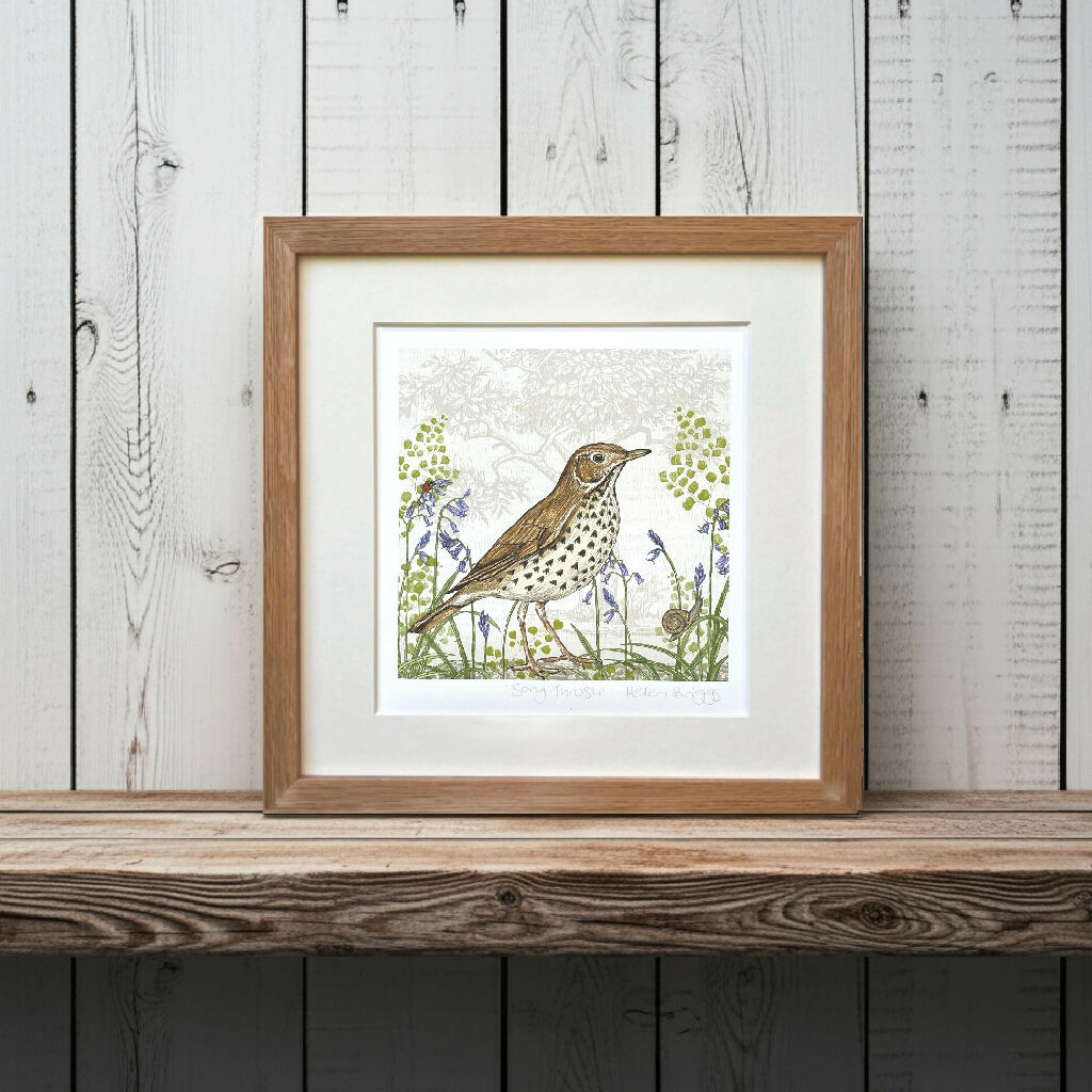 Inspired by the beauty of the British Countryside this signed hand-drawn print with an etched feel depicts a Song thrush in the dappled shade of wood.