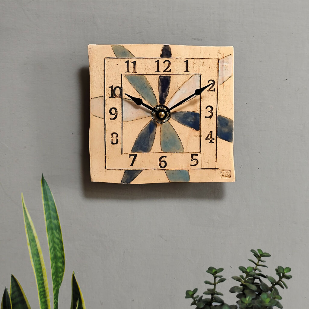 Small pottery clock features daisy petals in shaides of blue and large, clear numbers for easy time-telling. Made from a off-white clay.
