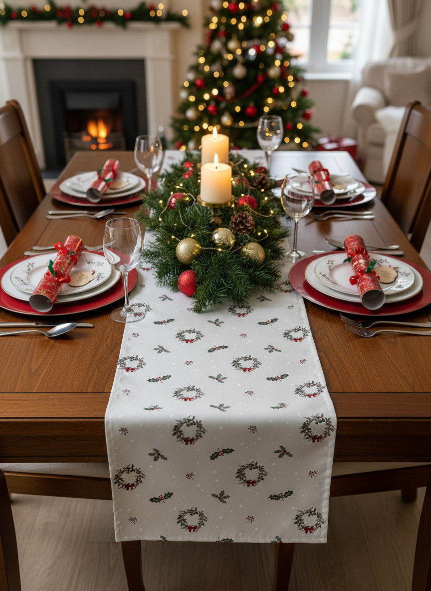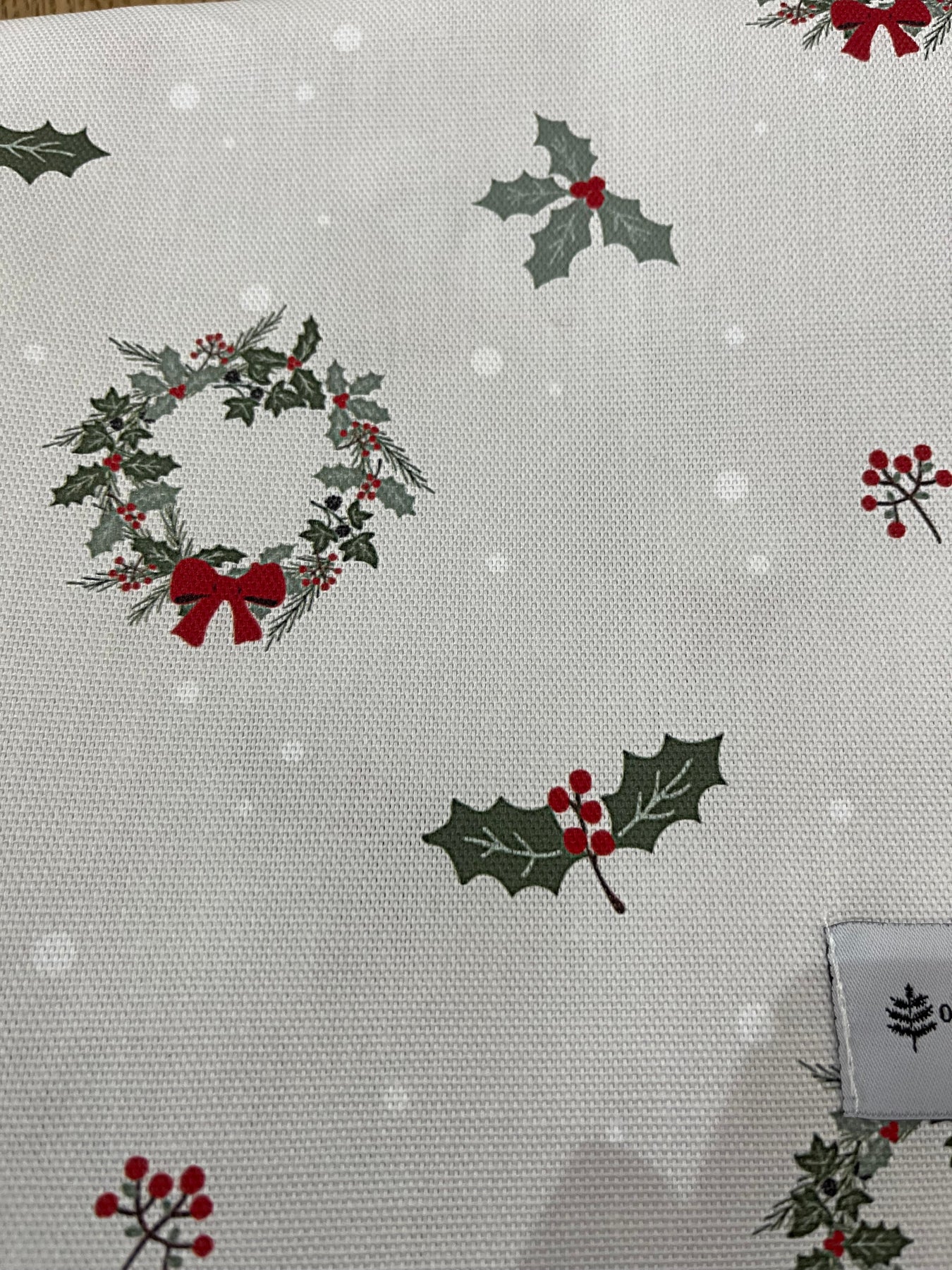Made from cotton, with a natural background, with Christmas colours, pairs excellently with our Table Runners and Tea Towels.