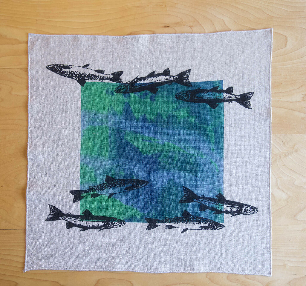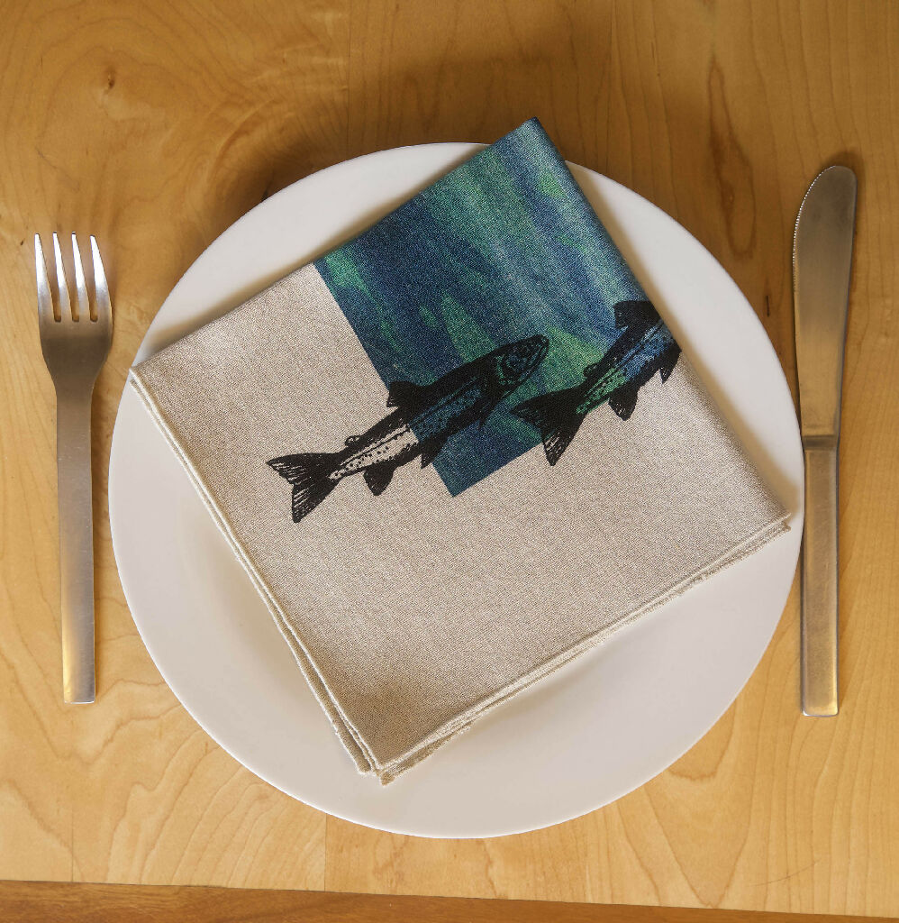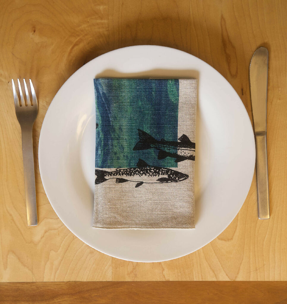 Each napkin is individually printed therefor the blend of blues and greens in the centre of the square will be different so no 2 napkins are the same.