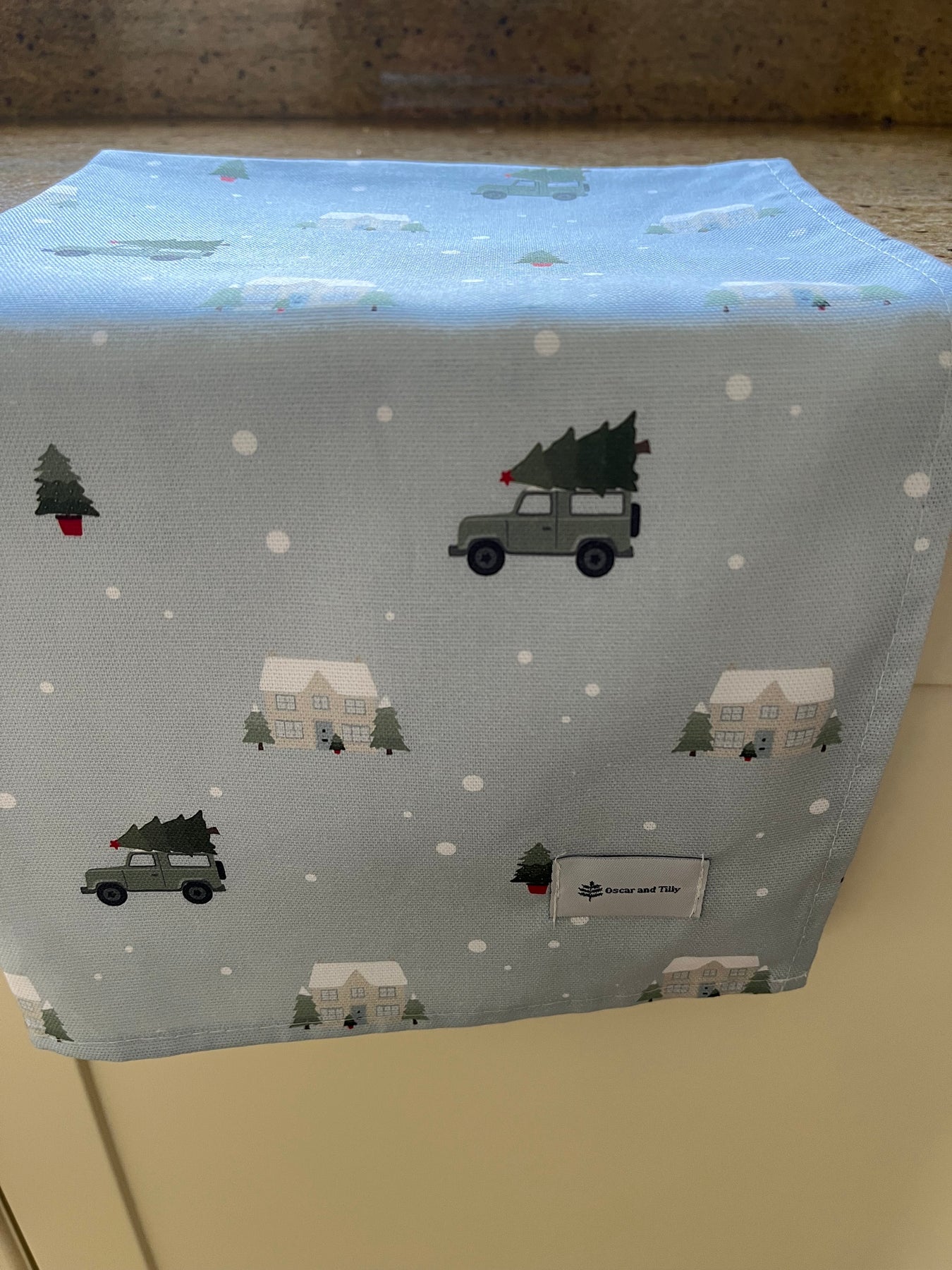 Made from cotton, with a dusty blue background, with Christmas colours, pairs excellently with our Table Runners and Tea Towels.