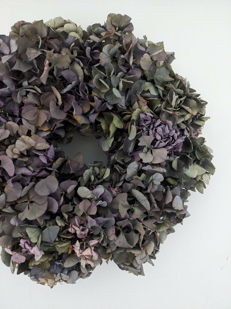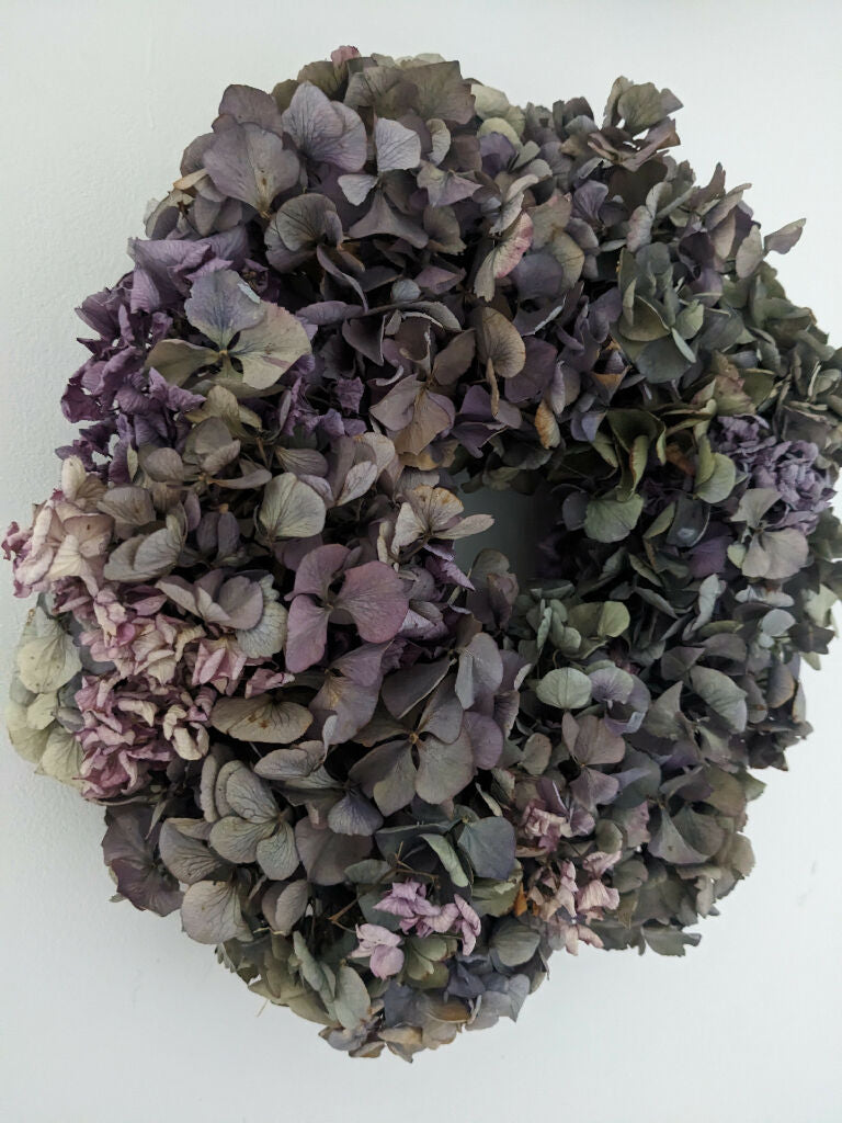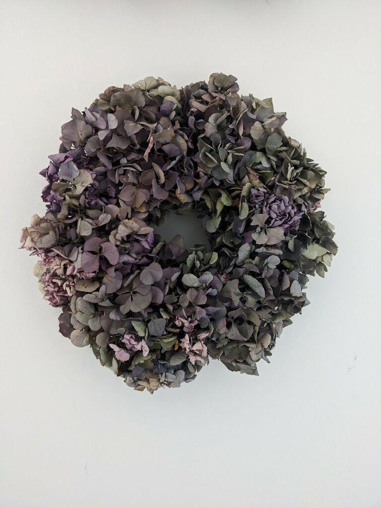 A delicate handmade wreath crafted from dried hydrangeas in soft purple pink tones. Measuring approximately 30cm in diameter, each bloom is grown and naturally dried in West Sussex, bringing gentle colour and texture to your home.