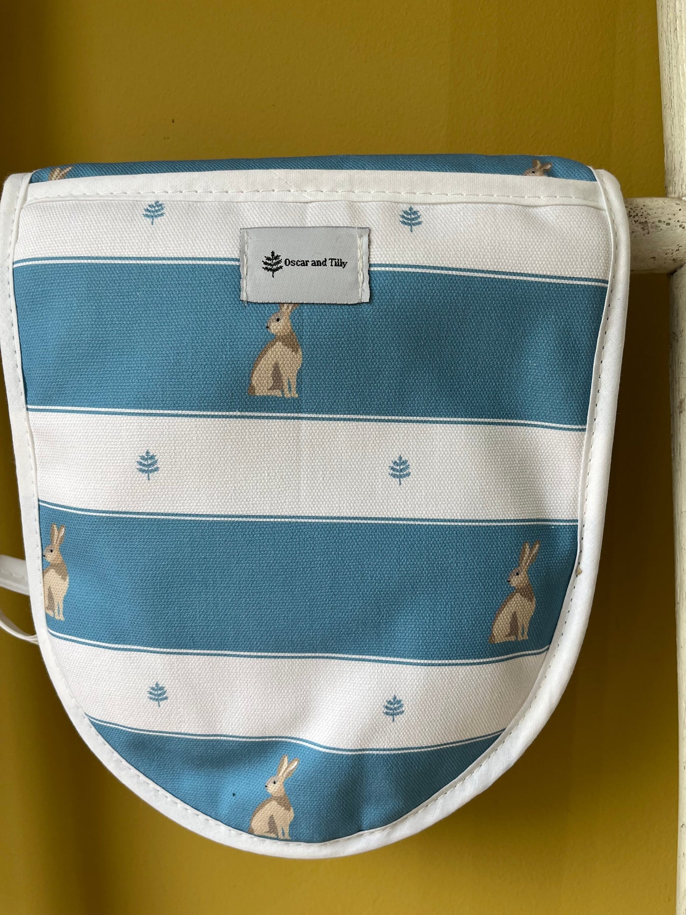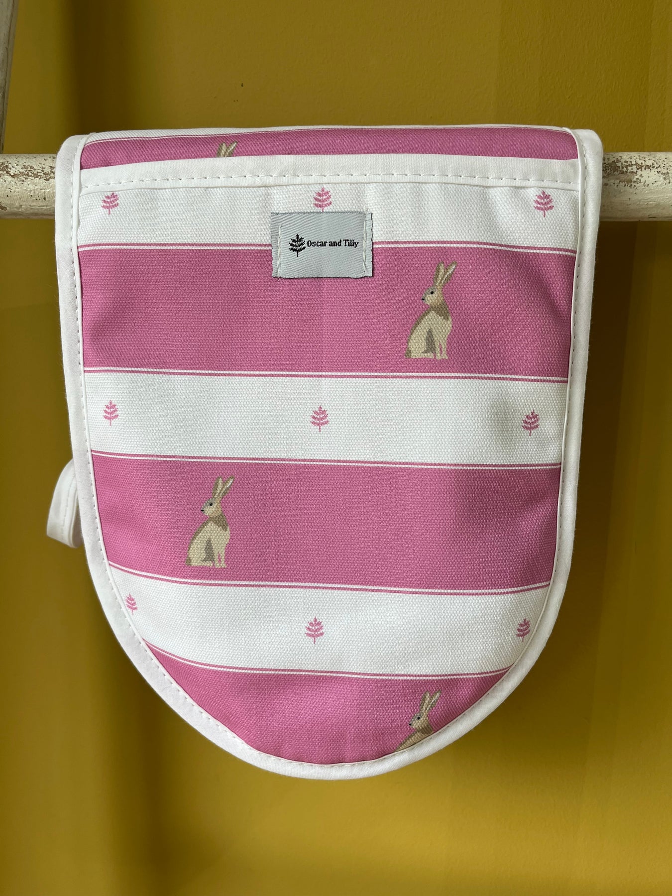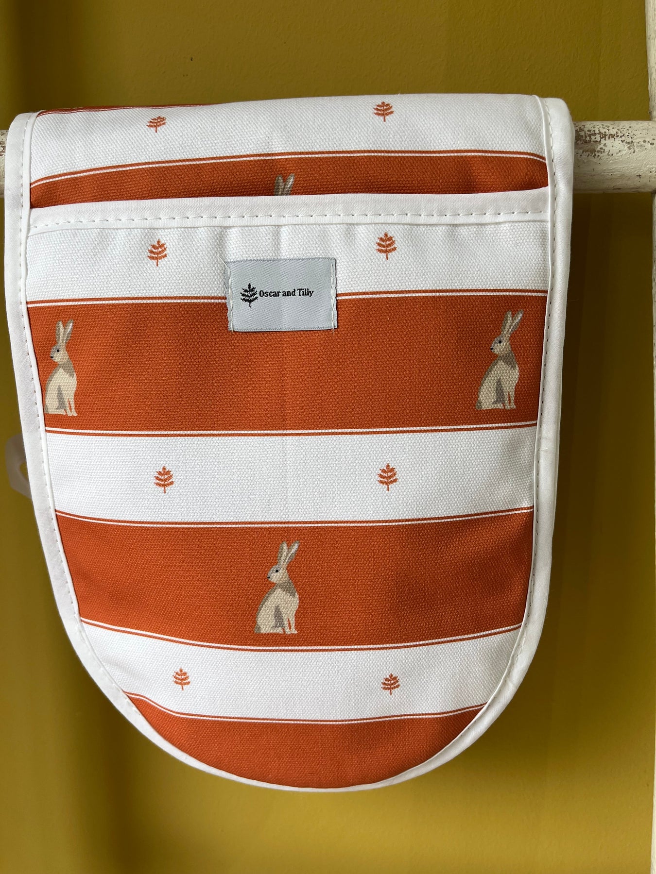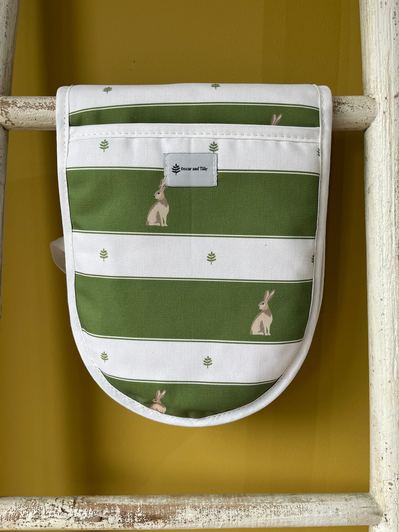 Hares dominate our British Countryside hence choosing these wonderful creatures for our soft textiles. Our oven gloves are wrapped in a lovely belly band so make a perfect gift or just to treat yourself.