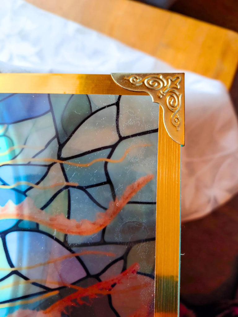 A perfect housewarming gift, it would look great on a bathroom windowsill. The design is framed with gold edging, with gold metal decorative corners.