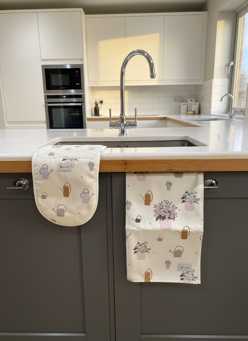 Beautifully designed and made in the UK. Oscar and Tilly are delighted to introduce a new range of Kitchen textiles with a lovely Watering Cans and Flowerpot design!