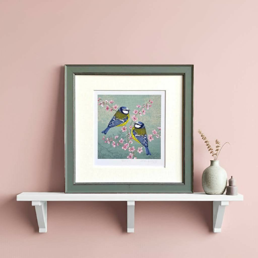 Inspired by the beauty of the British Countryside this hand-drawn print, with an etched feel, depicts bluetits in the dappled spring blossom branches.
