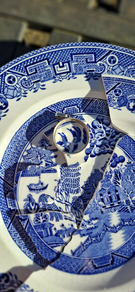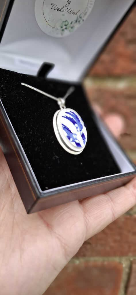 Hand crafted by Trisha Wood in Somerset, UK, this sterling silver pendant features reclaimed china with classic Willow pattern love birds pattern. A sustainable, one-of-a-kind piece of timeless charm makes a lovely china anniversary gift