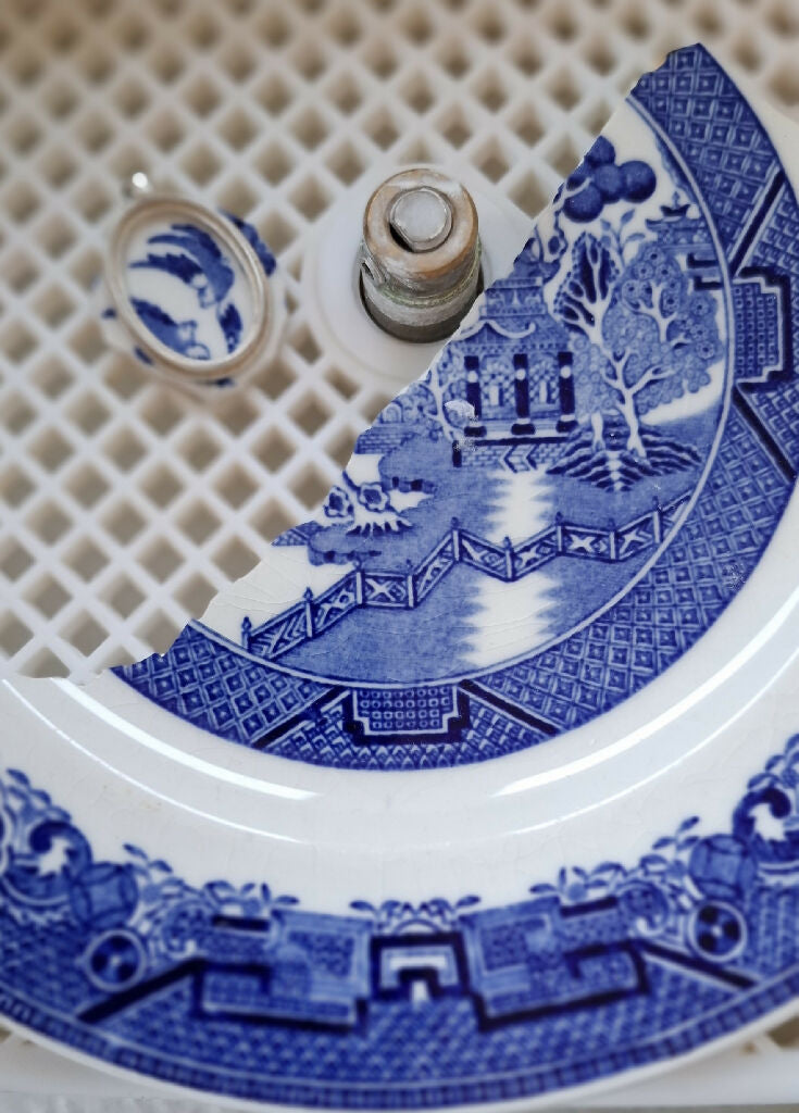 Very rare, delicate famous Willow Pattern Once a treasured plate, now given new life. This piece comes from a 1940s Willow pattern by North Staffordshire Pottery Co. England. Gentle signs of age remain, honoring its journey through time. Bright, beautiful, and full of old-world romance.
