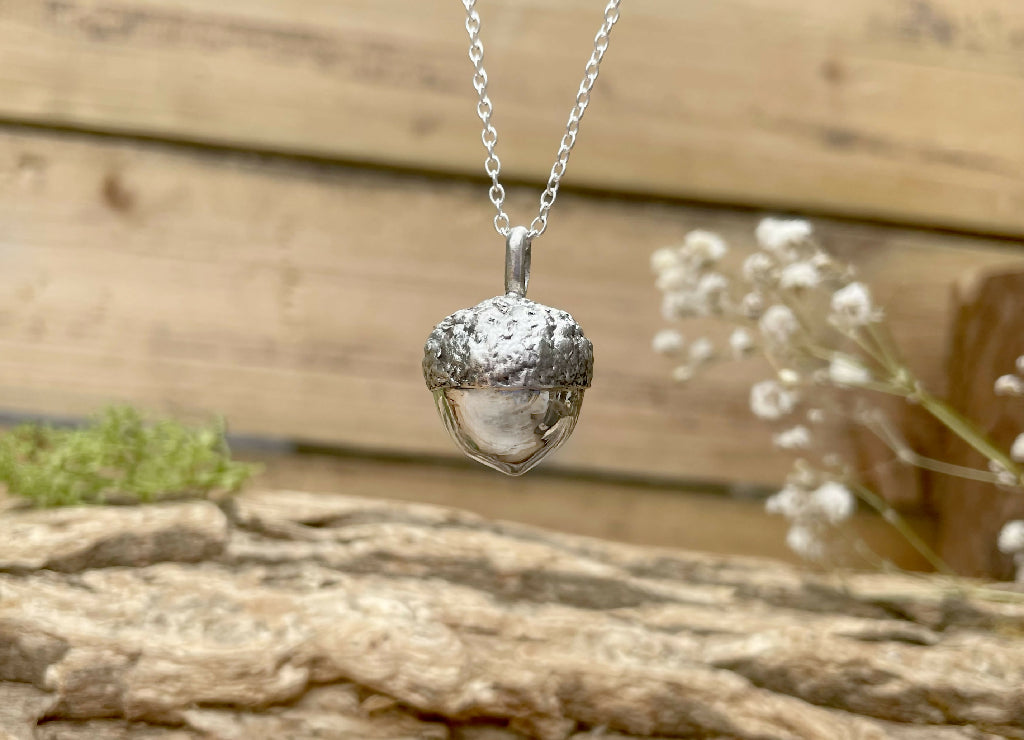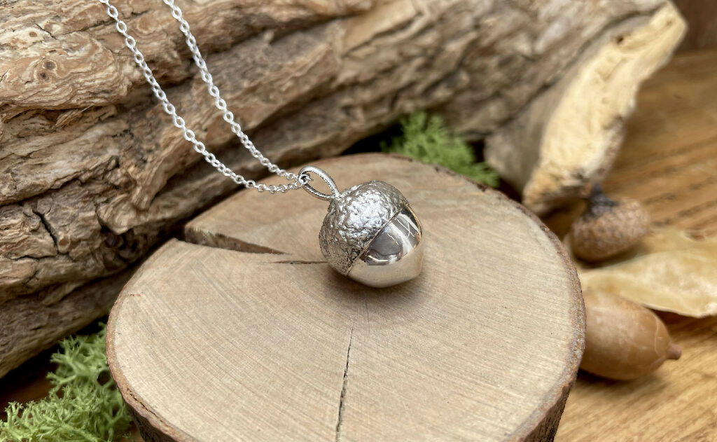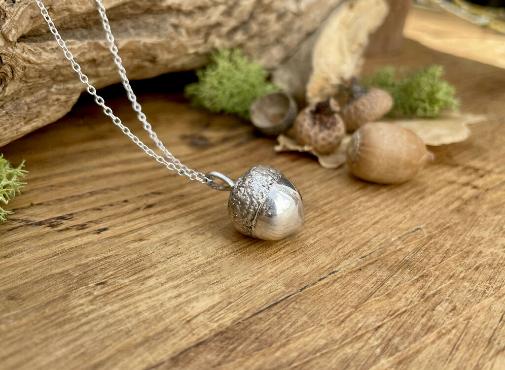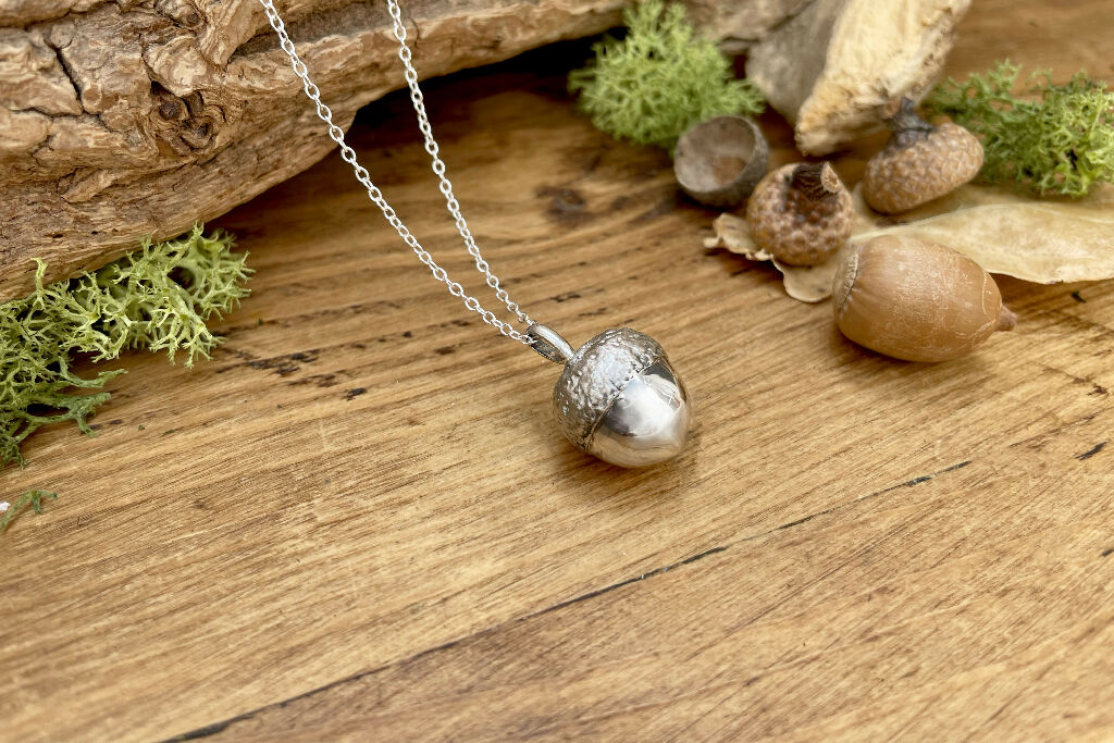Handcrafted in our rural Leicestershire studio, the acorn cap is cast from a real acorn in 925 Sterling Silver, capturing every delicate ridge. Paired with a polished silver acorn, this tactile, woodland-inspired pendant celebrates nature’s beauty.
