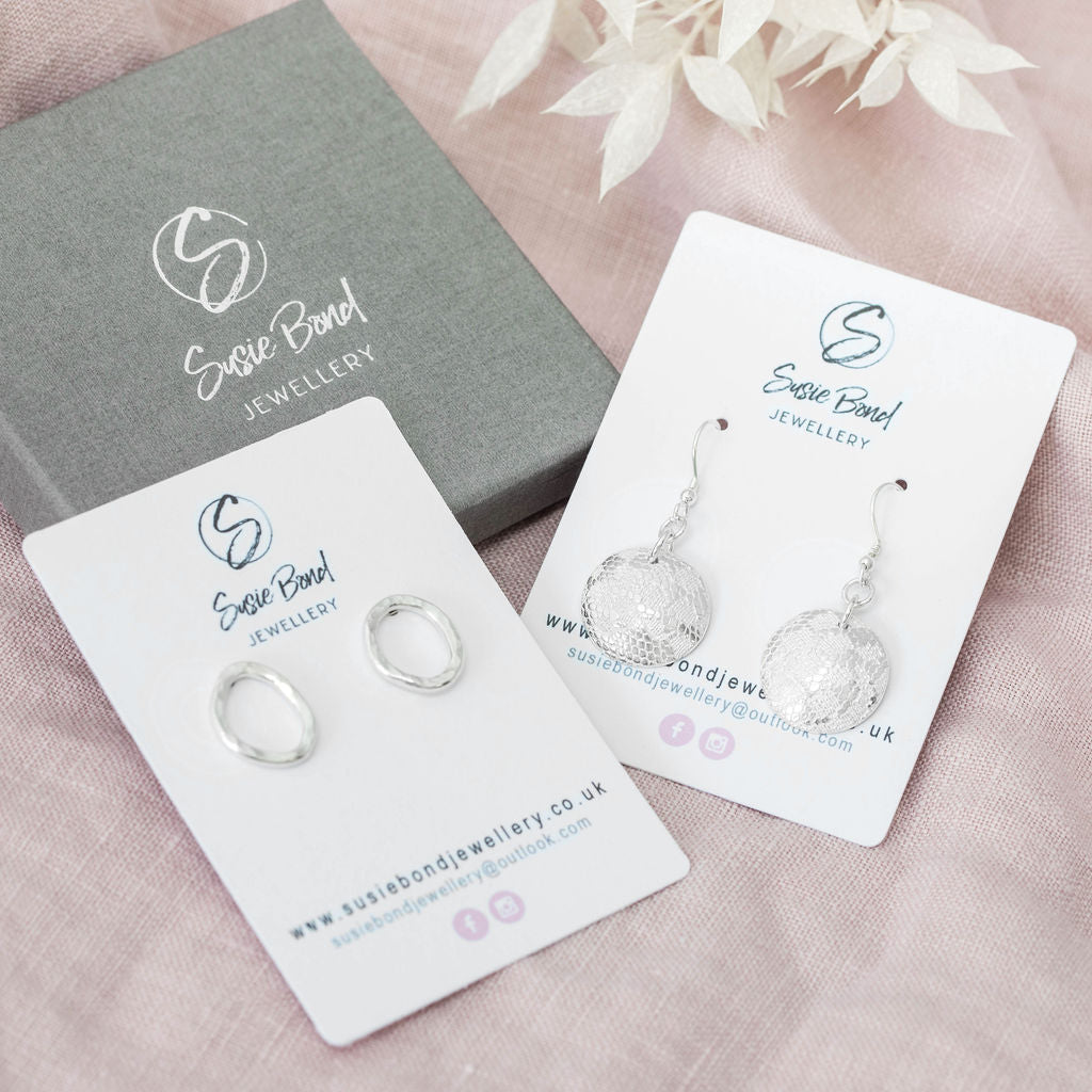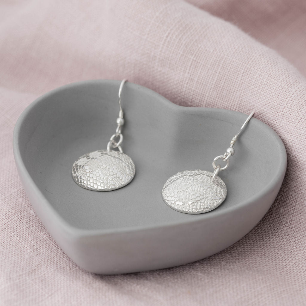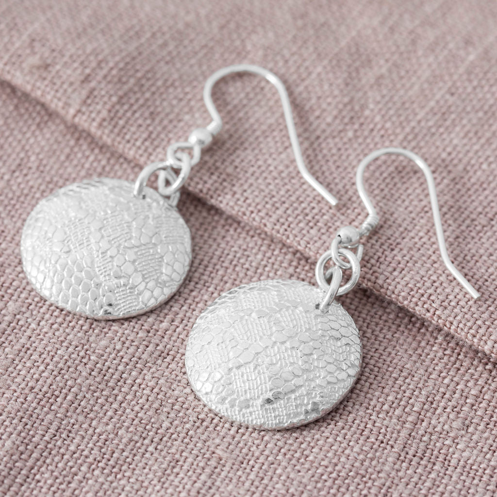 These fine silver earrings are textured with a delicate lacy pattern which helps them to twinkle in the ears of the wearer. The earring wires are made from sterling silver and the circles are made from fine silver.