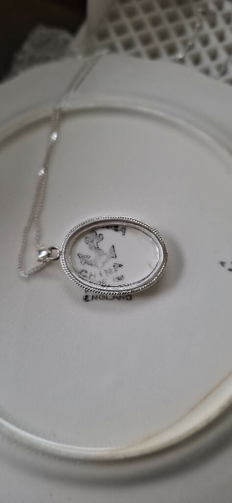 This pendant is made from fine vintage English bone china plate which has been cut to fit the beautiful sterling silver opened back pendant which has a lovely delicate rope edging finish.